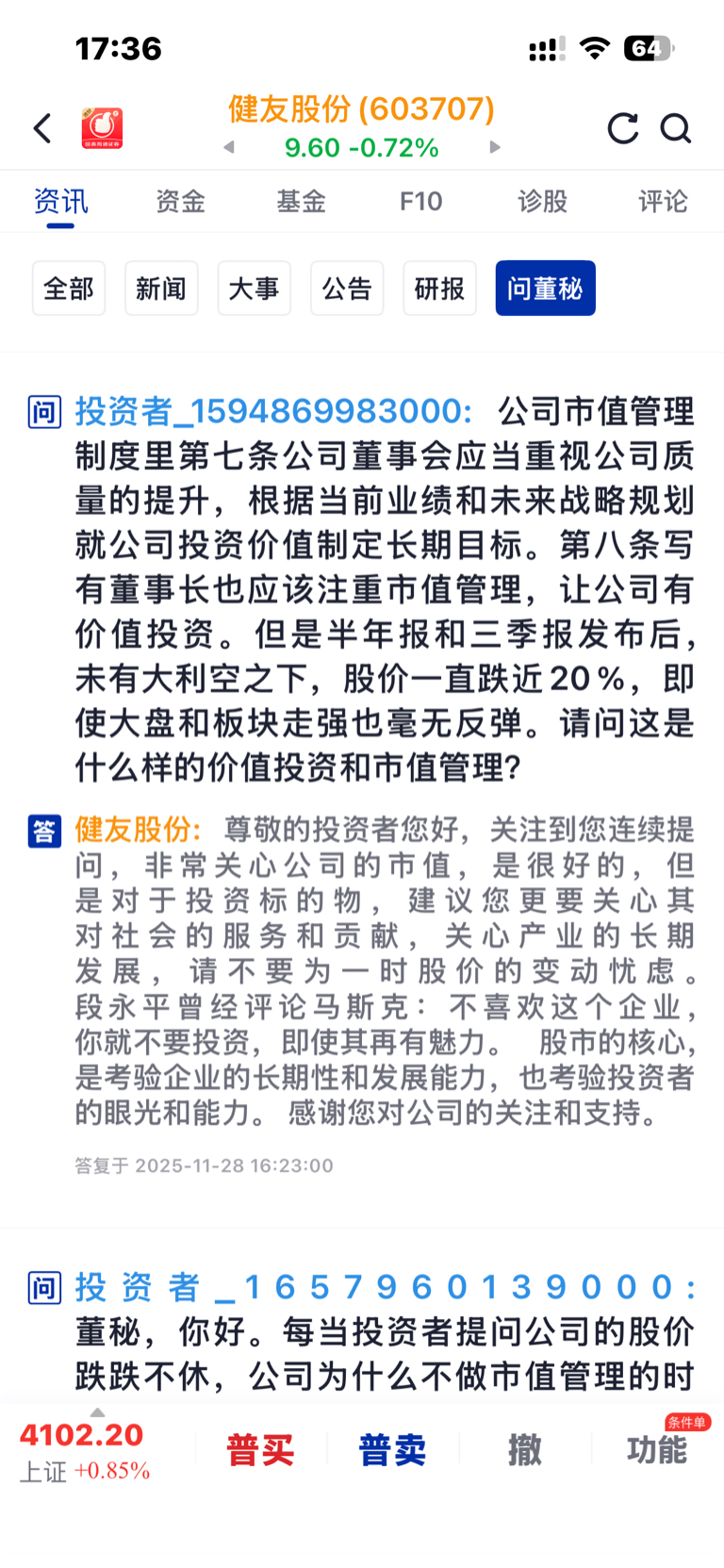 $健友股份(SH603707)$ 你看人家董米,多厉害,我股价跌,谁叫你买了的意思,你们怎么看
