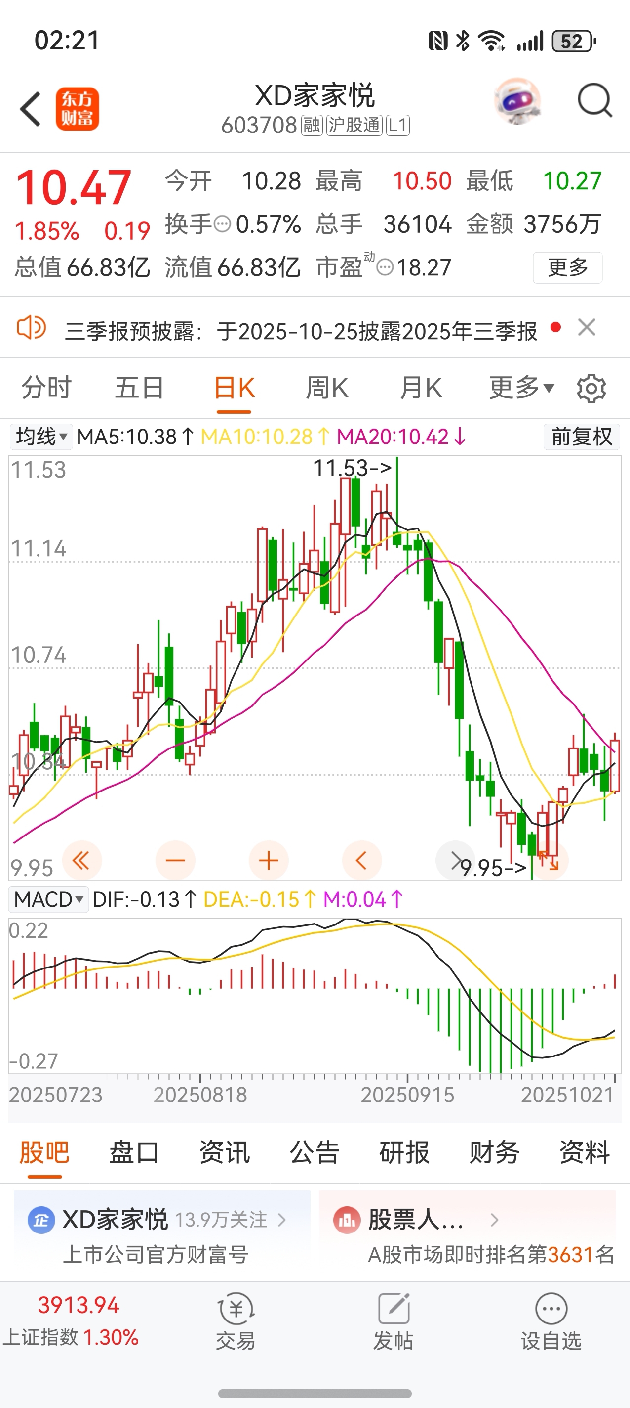 $XD家家悦(SH603708)$ 底气就是日线macd金叉后,开始启动第一根大红柱,希望这是一波主升浪!