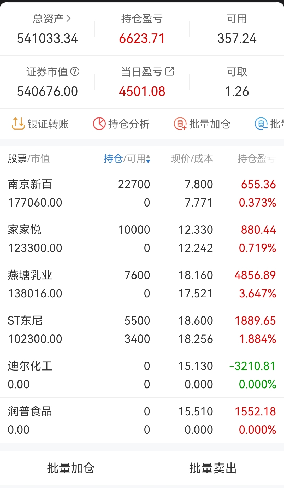 $家家悦(SH603708)$ $迪尔化工(SZ920304)$ $润普食品(SZ920422)$ 50万实盘第14天(前面因黑粉被迫停更),自从不亮实盘,都没人关注了,还掉了2个粉丝,最近操盘十分不顺,昨天和今天润普食品卖飞,今天迪尔化工割肉卖飞。目前总资产541033.34元,今日盈利+4501.08元。