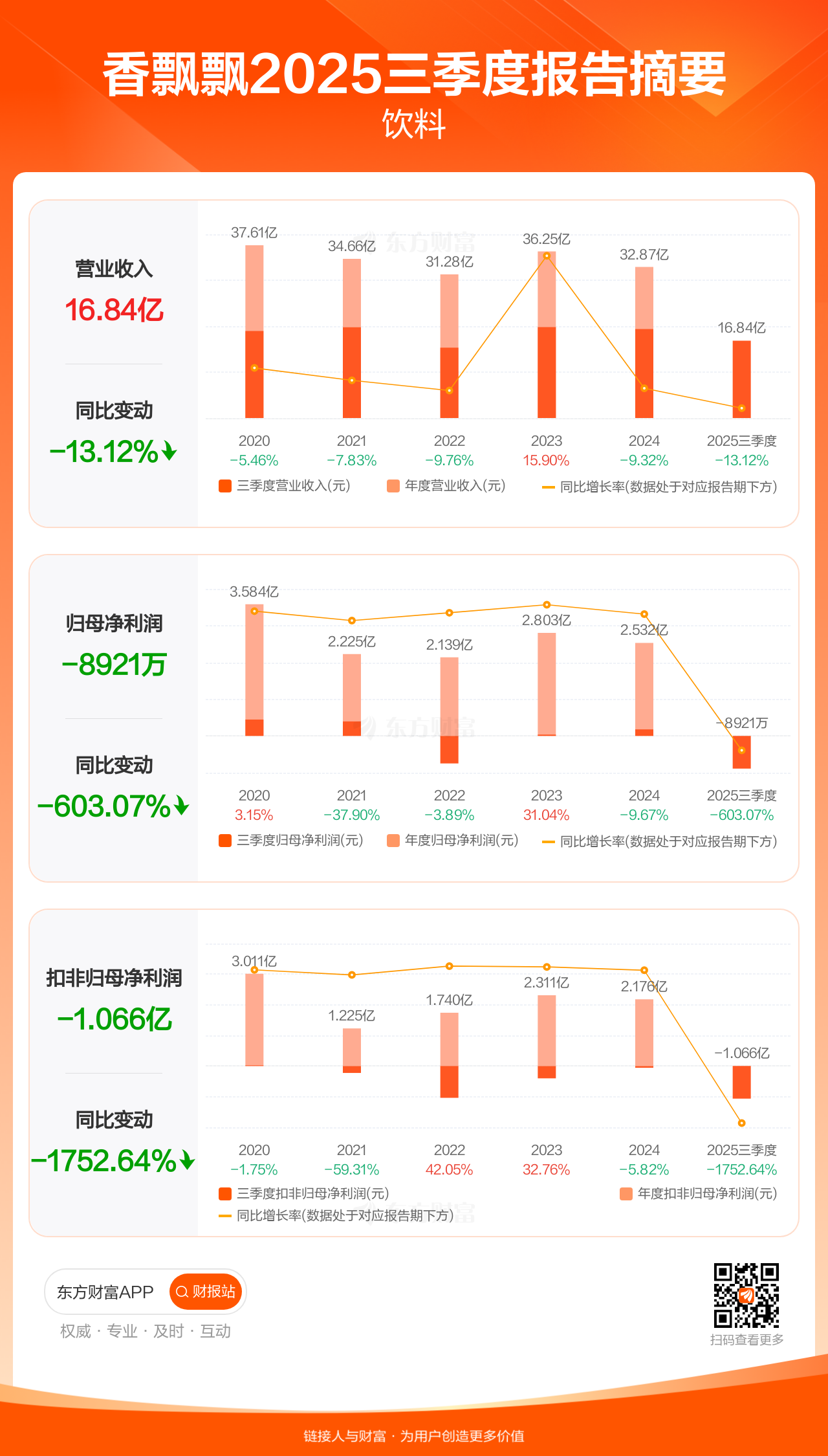 香飘飘10月31日发布2025年三季报显示,公司前三季实现营业收入16.84亿元,同比下滑13.12%;归母净利润-8920.72万元;扣非归母净利润-1.07亿元。