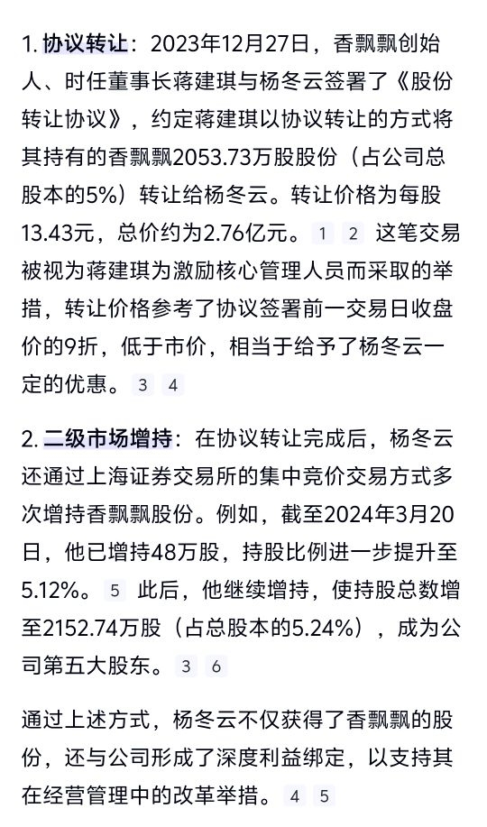 杨冬云2024年3月20号,增持香飘飘48万股,增持股价格在16元左右,2023