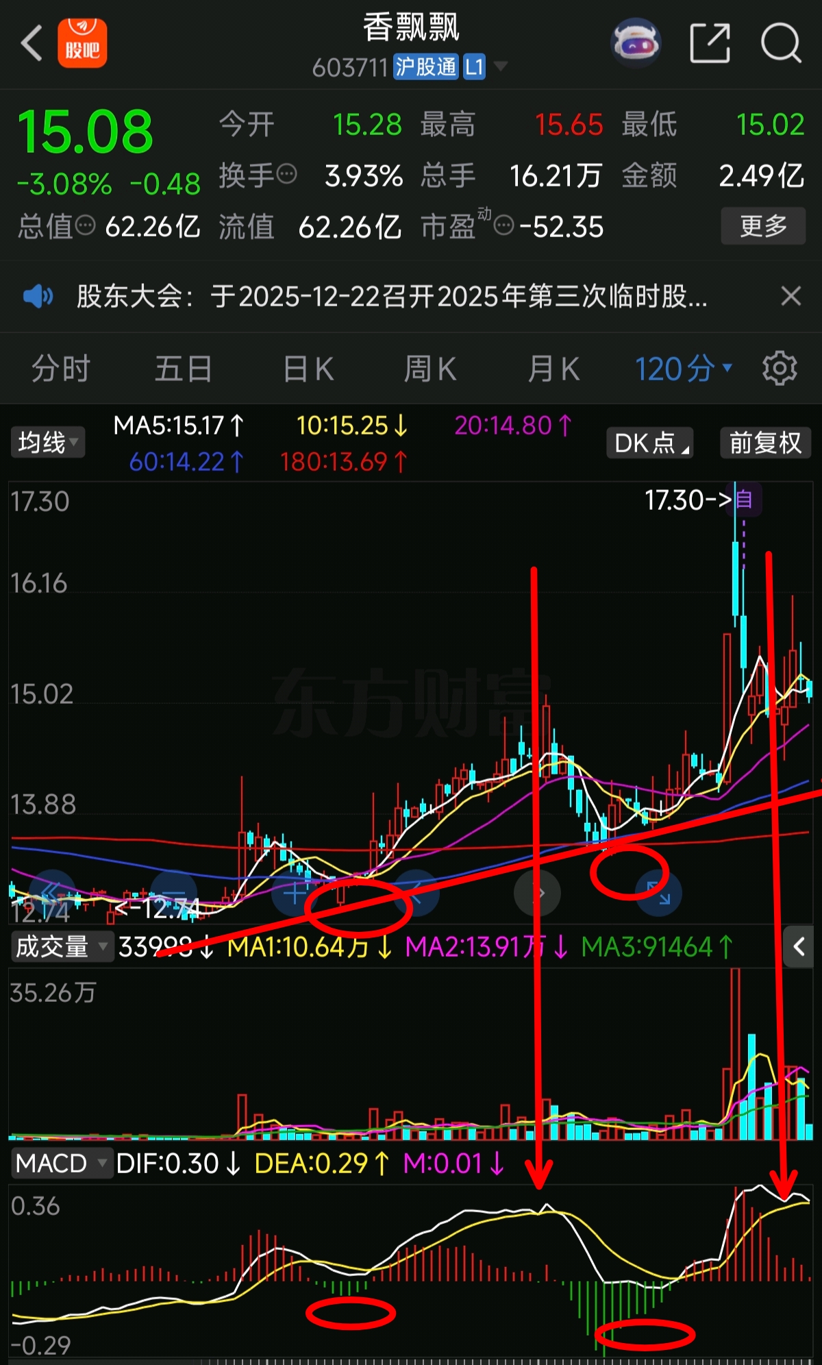 $香飘飘(SH603711)$ 已经顶背离了,双头。
