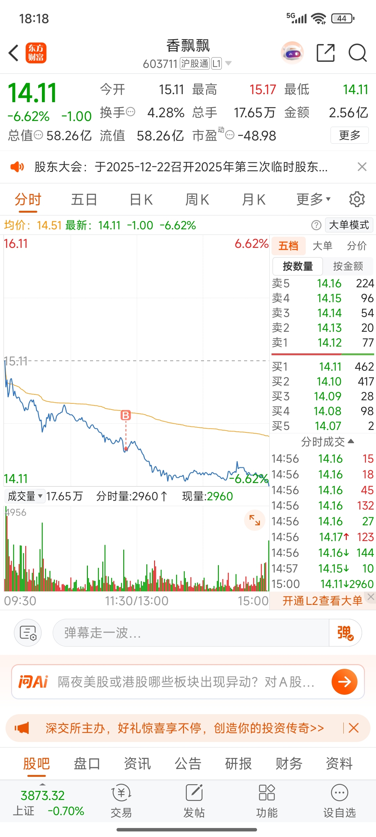 $香飘飘(SH603711)$ 兄弟们我14.41进来找套