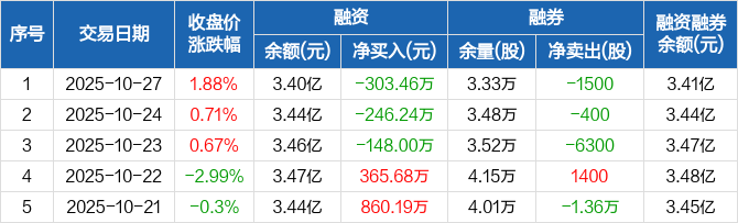 融资方面,当日融资买入850.54万元,融资偿还1154万元,融资净偿还303.46万元,连续3日净偿还累计697.7万元。融券方面,融券卖出0股,融券偿还1500股,融券余量3.33万股,融券余额66.93万元。融资融券余额合计3.41亿元。