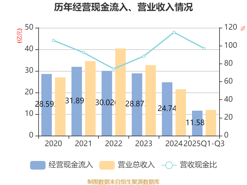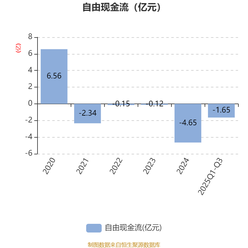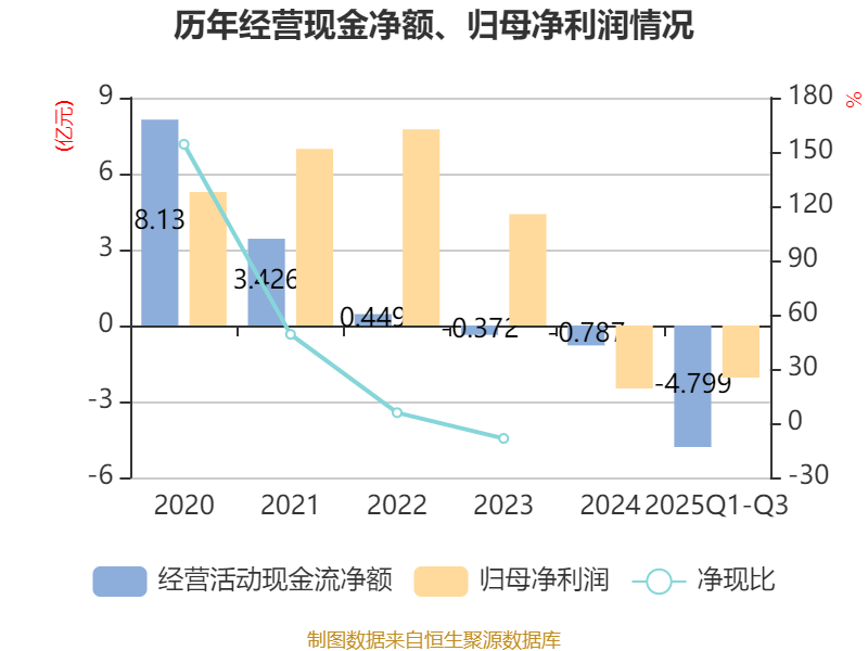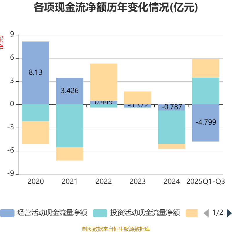 2025年前三季度,公司经营活动现金流净额为-4.8亿元,同比减少957.72万元;筹资活动现金流净额2.38亿元,同比增加2.6亿元;投资活动现金流净额3.47亿元,上年同期为-2.73亿元。