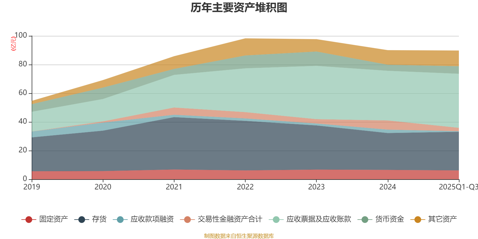 资产重大变化方面,截至2025年三季度末,公司交易性金融资产合计较上年末减少63.24%,占公司总资产比重下降4.49个百分点;应收票据及应收账款较上年末增加8.77%,占公司总资产比重上升3.51个百分点;应收款项融资较上年末减少81.79%,占公司总资产比重下降2.14个百分点;存货较上年末增加4.9%,占公司总资产比重上升1.49个百分点。