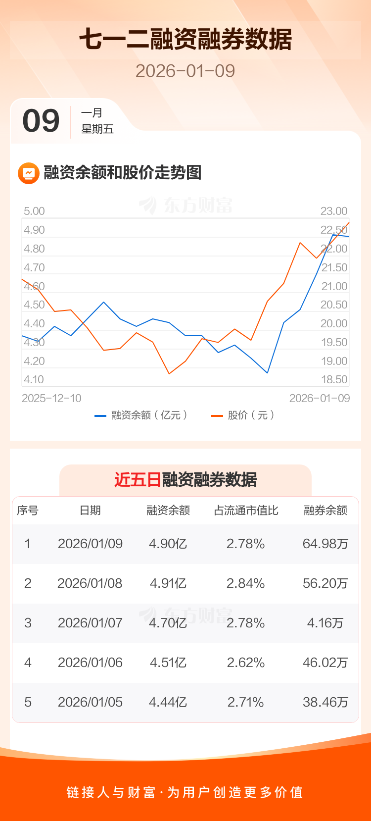 交易所最新数据显示,七一二于2026年1月9日获融资买入1.24亿元,融资偿还1.25亿元,当日融资净偿还19.5万元。目前,该股融资余额4.90亿,占流通市值比例为2.78%。
