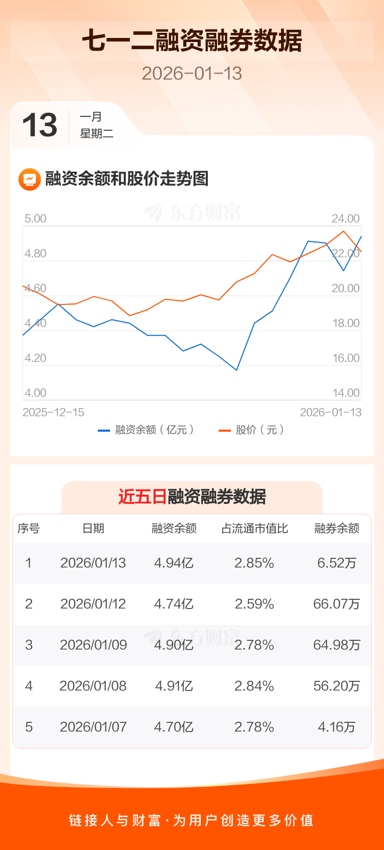 交易所最新数据显示,七一二于2026年1月13日获融资买入1.11亿元,融资偿还9076.03万元,当日融资净买入1978.89万元。目前,该股融资余额4.94亿,占流通市值比例为2.85%。