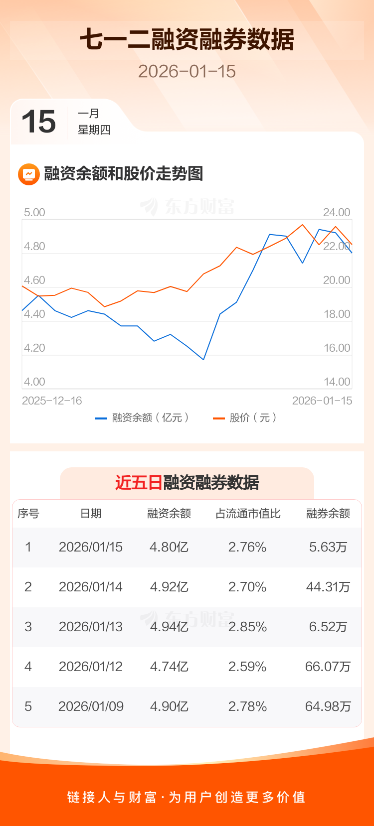 交易所最新数据显示,七一二于2026年1月15日获融资买入6321.24万元,融资偿还7568.91万元,当日融资净偿还1247.67万元。目前,该股融资余额4.80亿,占流通市值比例为2.76%。