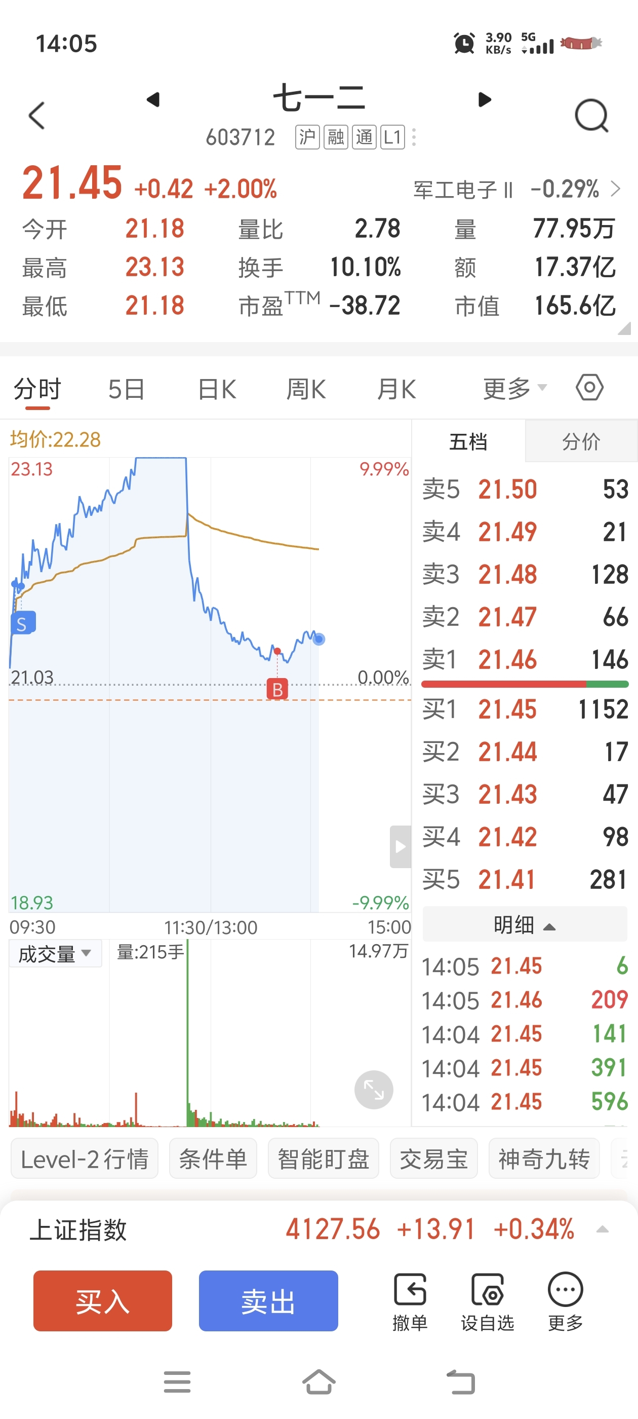 $七一二(SH603712)$ 22卖了,没想到让我21.33买回。感谢!