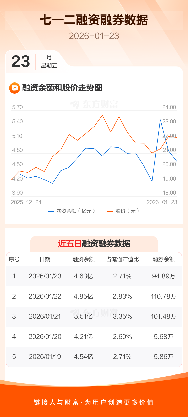 交易所最新数据显示,七一二于2026年1月23日获融资买入6764.80万元,融资偿还8939.95万元,当日融资净偿还2175.15万元。目前,该股融资余额4.63亿,占流通市值比例为2.71%。