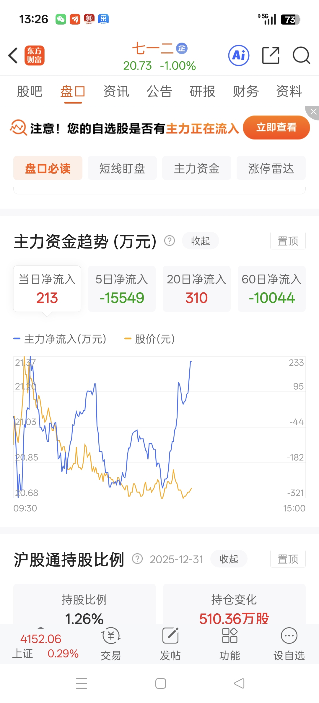 $七一二(SH603712)$ 早上开盘净流入这个位置还红一个多点呢,这会又到这个位置却还在水下闷着