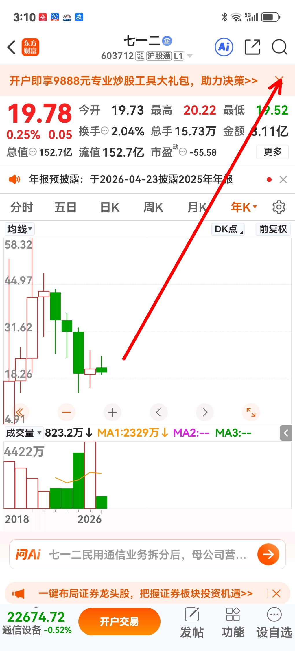 $七一二(SH603712)$ 七一二,2026年收盘价71.2元。年线巨量!