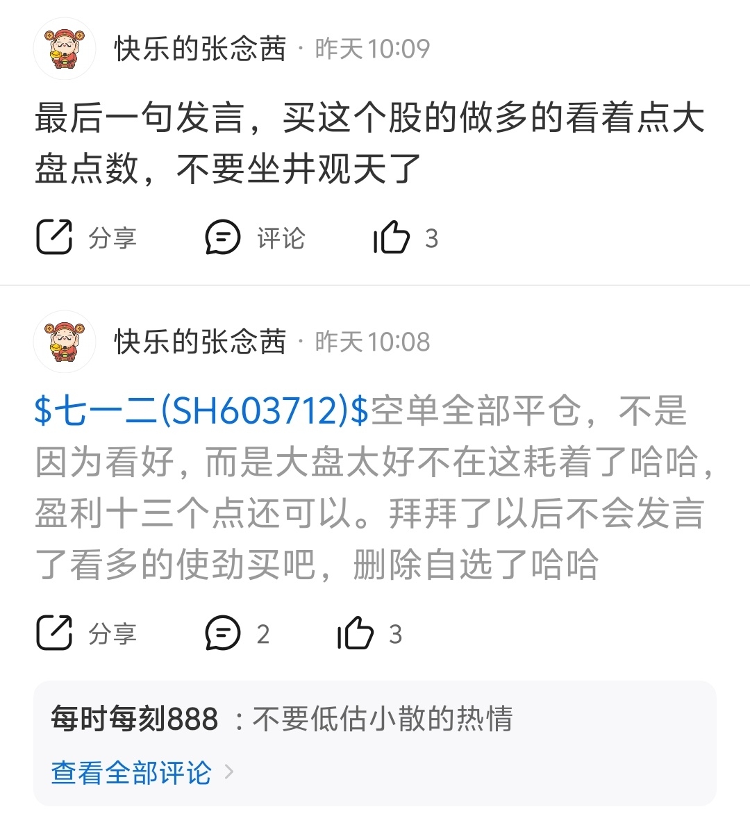 温馨提示: 1.根据《证券法》规定,禁止编造、传播虚假信息或者误导性信息,扰乱证券市场;2.用户在本社区发表的所有资料、言论等仅代表个人观点,与本网站立场无关,不对您构成任何投资建议。用户应基于自己的独立判断,自行决定证券投资并承担相应风险。《东方财富社区管理规定》