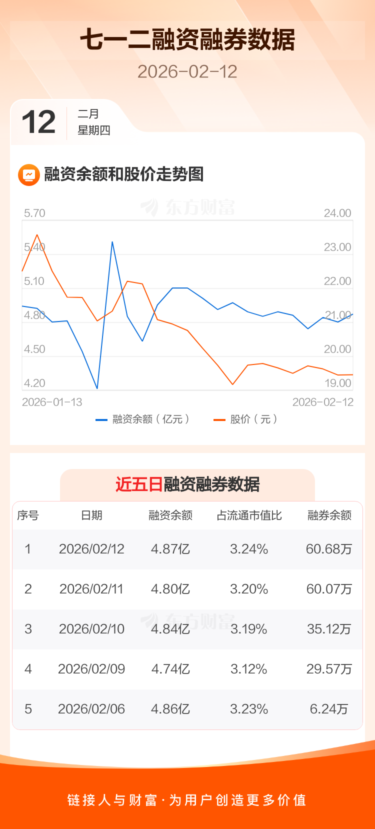 交易所最新数据显示,七一二于2026年2月12日获融资买入2281.62万元,融资偿还1600.92万元,当日融资净买入680.7万元。目前,该股融资余额4.87亿,占流通市值比例为3.24%。