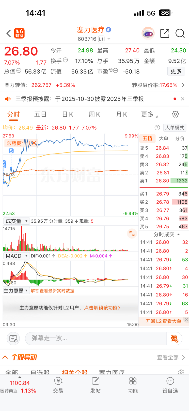 $塞力医疗(SH603716)$ 今天的涨幅完全板块轮动带上来的,跟个股关系不大。今年板块轮动一般不停留,一日的过程。昨晚的复盘结果和今天大大相反。事出反常必有妖,里面悬着什么谜团呢?接下里看走势吧。