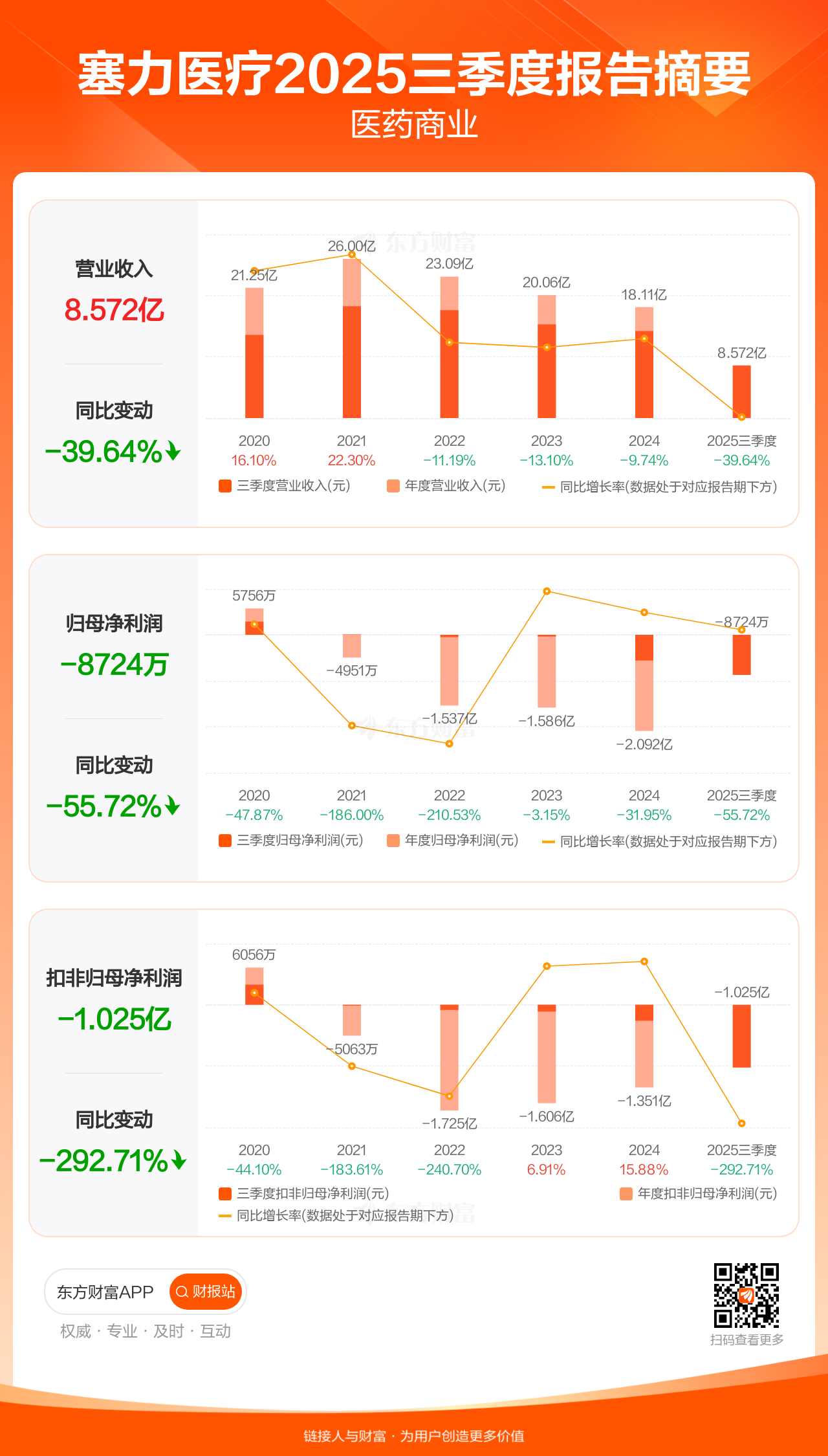 塞力医疗10月30日发布2025年三季报显示,公司前三季实现营业收入8.57亿元,同比下滑39.64%;归母净利润-8724.41万元;扣非归母净利润-1.03亿元。