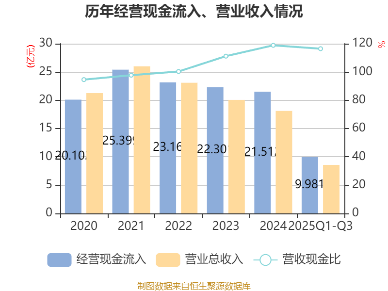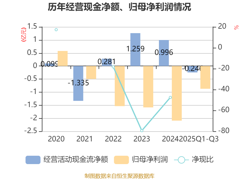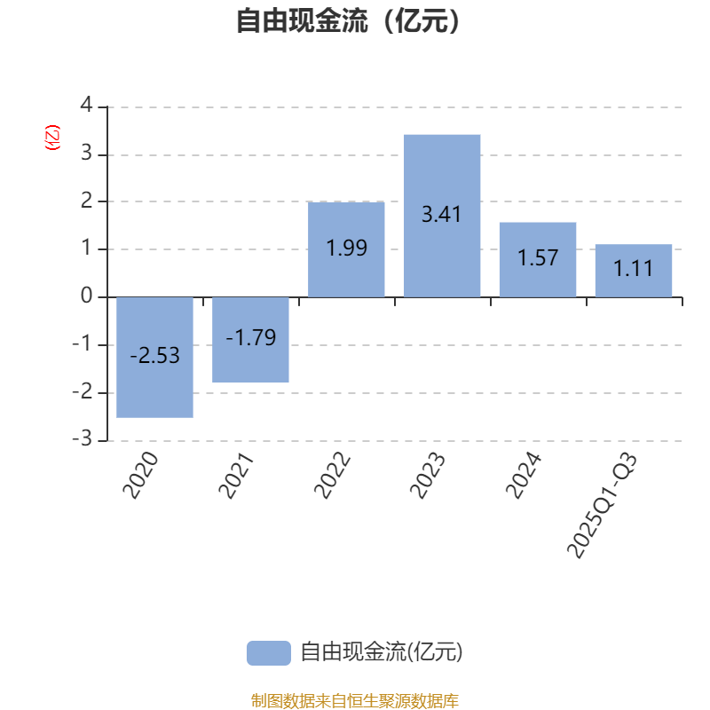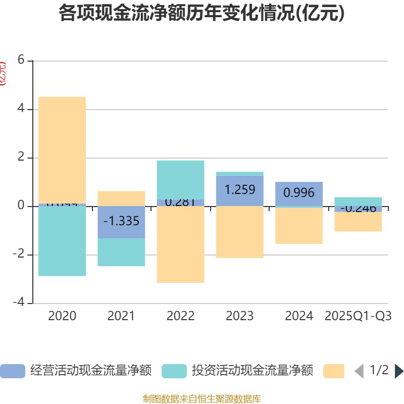 2025年前三季度,公司经营活动现金流净额为-2459.95万元,同比减少2509.57万元;筹资活动现金流净额-8042.31万元,同比减少6105.8万元;投资活动现金流净额3608.38万元,上年同期为754万元。