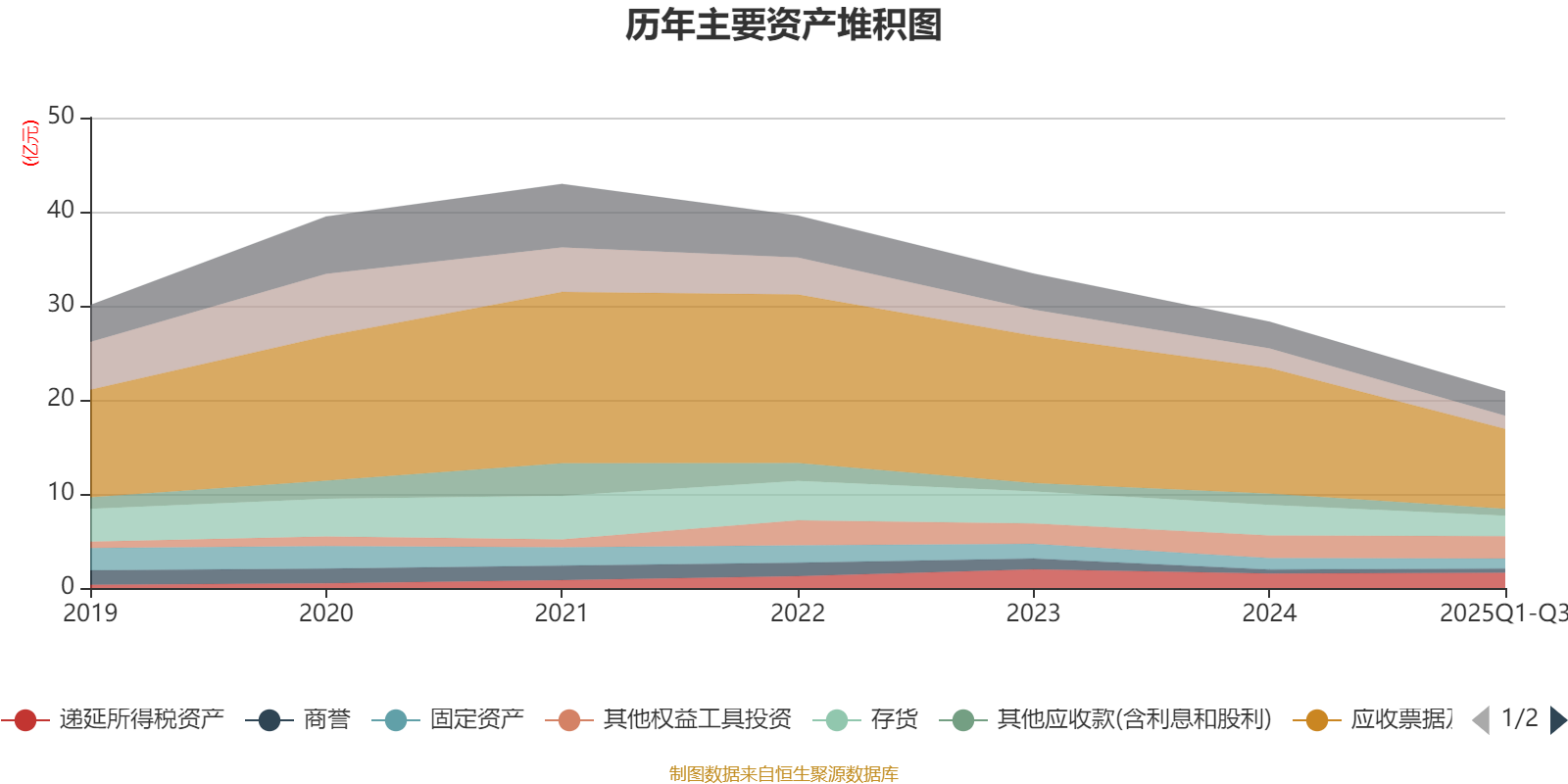 资产重大变化方面,截至2025年三季度末,公司应收票据及应收账款较上年末减少36.37%,占公司总资产比重下降6.53个百分点;其他权益工具投资较上年末减少0.63%,占公司总资产比重上升2.92个百分点;递延所得税资产较上年末增加6.46%,占公司总资产比重上升2.38个百分点;存货较上年末减少33.42%,占公司总资产比重下降1.14个百分点。