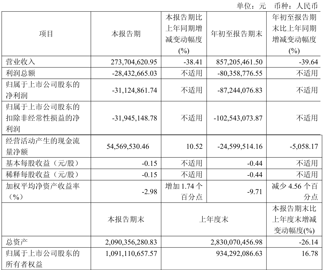 中证智能财讯塞力医疗(603716)10月30日披露2025年第三季度报告。前三季度公司实现营业总收入8.57亿元,同比下降39.64%;归母净利润亏损8724.41万元,上年同期亏损5602.51万元;扣非净利润亏损1.03亿元,上年同期亏损2611.17万元;经营活动产生的现金流量净额为-2459.95万元,上年同期为49.61万元;报告期内,塞力医疗基本每股收益为-0.44元,加权平均净资产收益率为-9.71%。