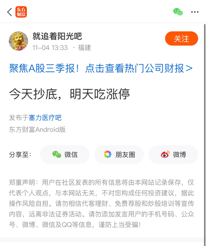 温馨提示: 1.根据《证券法》规定,禁止编造、传播虚假信息或者误导性信息,扰乱证券市场;2.用户在本社区发表的所有资料、言论等仅代表个人观点,与本网站立场无关,不对您构成任何投资建议。用户应基于自己的独立判断,自行决定证券投资并承担相应风险。《东方财富社区管理规定》