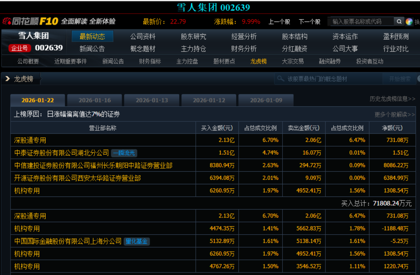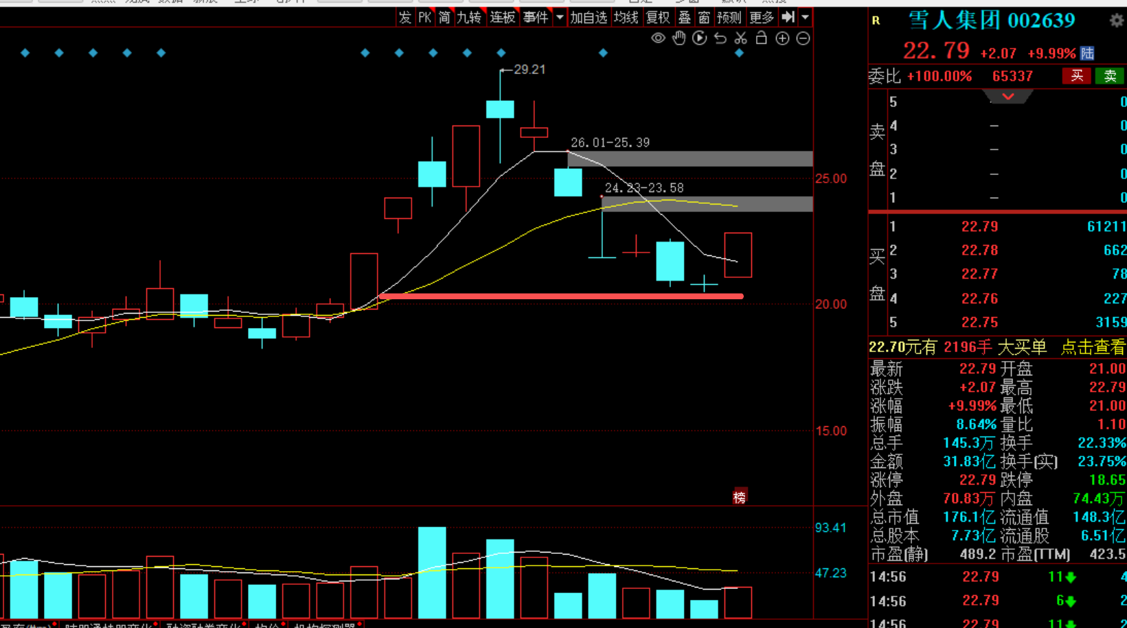 雪人昨天自然涨停,技术上看也是一个底分型结构,中间低两边搞,也叫早晨之星,属于是反转结构。我是一直盯着它,第一波是1月14号止盈离场的,这一波杀跌已经结束,资金第二次进场。龙虎榜数据来看,游资进行操底,机G出局,YOU资讲究短频快今天存在一进二,三板提示异动,还有套利空间。
