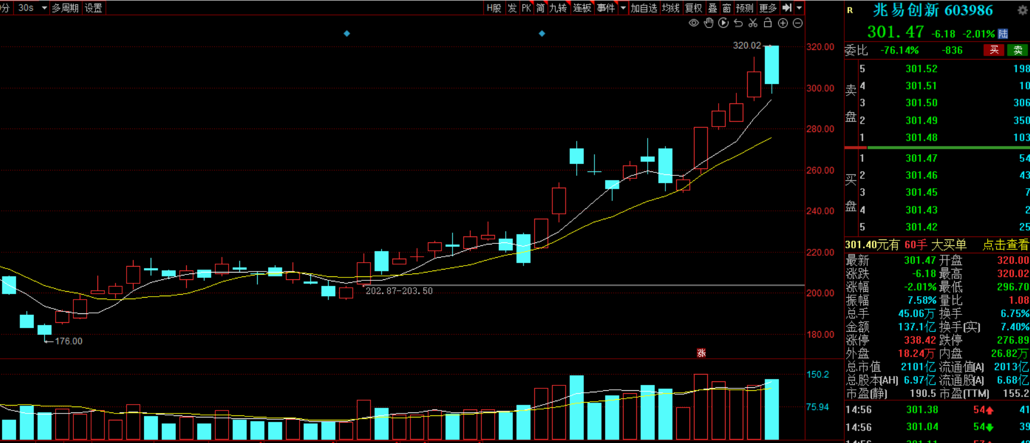 昨天高开低走出中阴线几乎是阴包阳,争议比较大,现在的核心问题是这里是不是顶。顶部结构第一看量,量能无异常,趋势龙头顶部出货至少要放倍量,昨天是平量主力也没有运作空间。第二看换手,昨天换手率只有7%,一般来说顶部结构换手要在30%以上,基本都在50%。兆易是一路换手涨起来的,资金介入程度很深,7%的换手是不足以出货的。第三逻辑是否反转存储芯片涨价还在继续,业绩还没有发布,依然还存在预期差,所以兆易这个位置震荡分歧一下依然是机会,目前10日均线上方都是安全的。