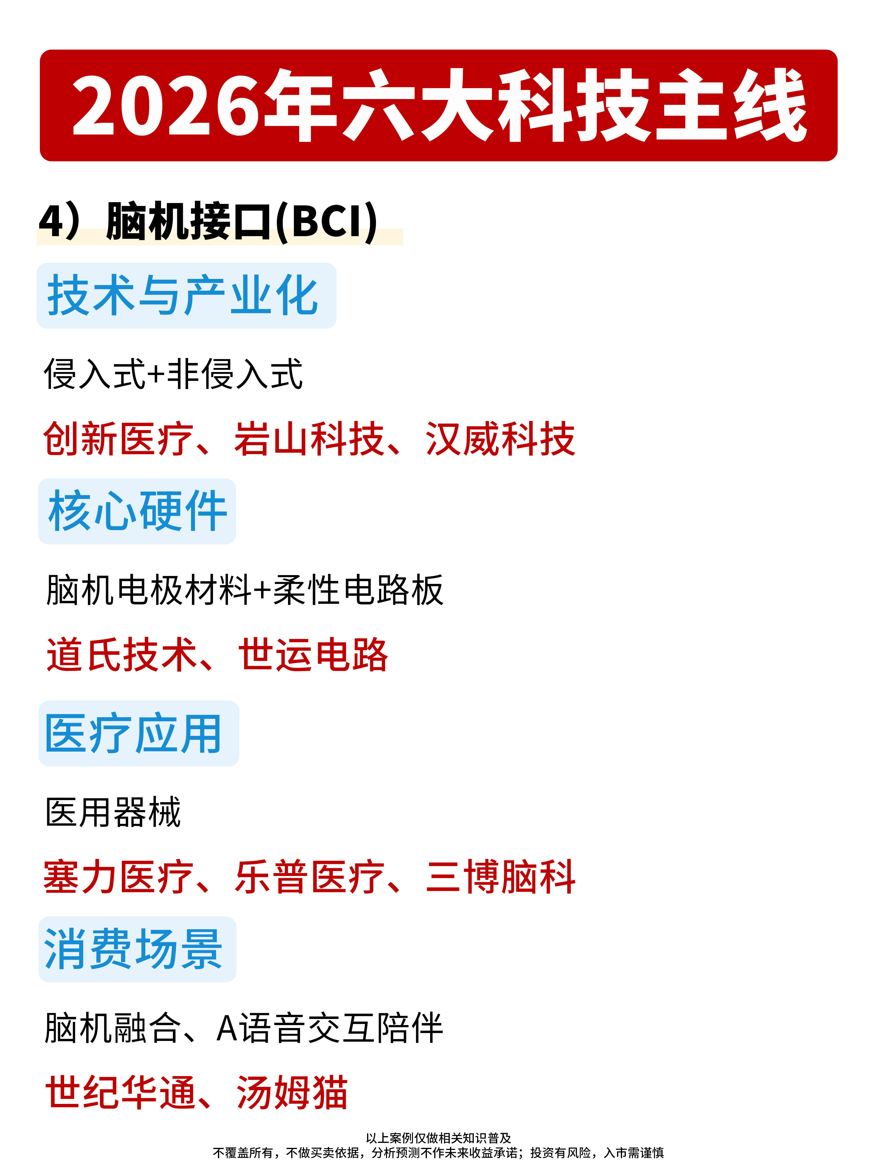 2026年六大科技主线t脑机接口(BCI)技术与产业化侵入式+非侵入式创新医疗、岩山科技、汉威科技核心硬件脑机电极材料+柔性电路板道氏技术、世运电路医疗应用医用器械塞力医疗、乐普医疗、三博脑科消费场景脑机融合、A语音交互陪伴世纪华通、、汤姆猫不覆盖所有,不做买卖依据,分析预测不作未来收益承诺;投资有风险