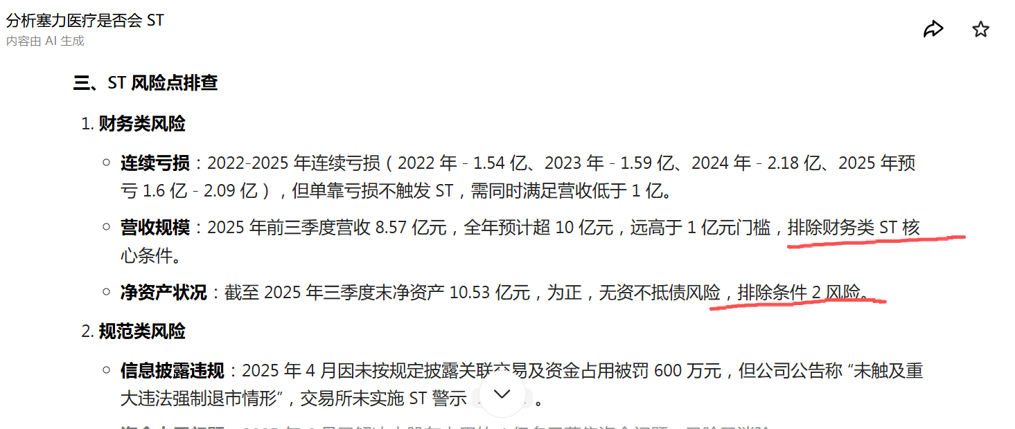 $塞力医疗(SH603716)$ 目前没有触发ST风险。别吓唬自己,好吧