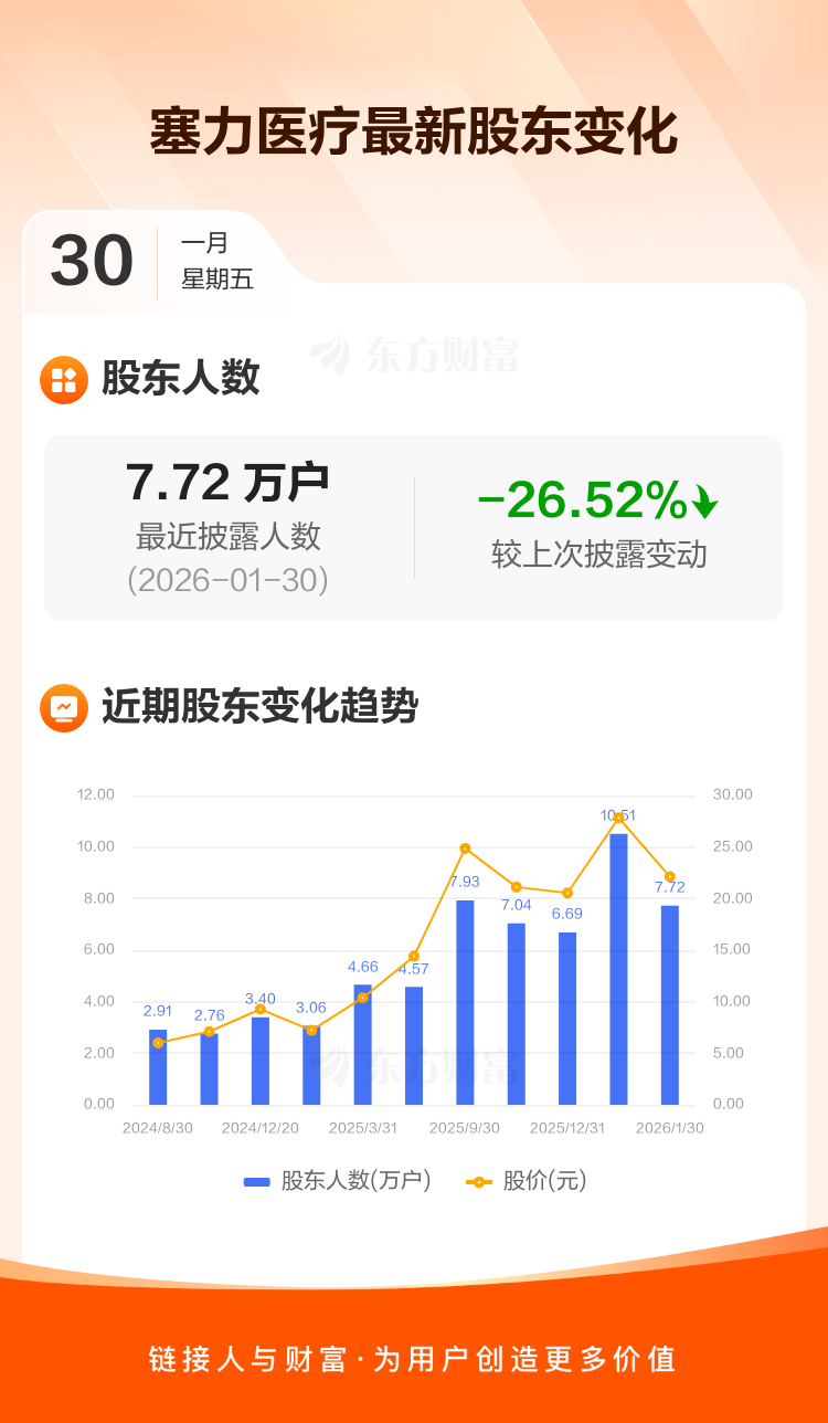 塞力医疗:截至1月30日最新股东户数7.72万户,较上期减少26.52%