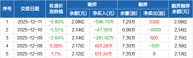 融资方面,当日融资买入2956.44万元,融资偿还3553.23万元,融资净偿还596.79万元,连续3日净偿还累计925.8万元。融券方面,融券卖出3400股,融券偿还100股,融券余量7.29万股,融券余额45.34万元。融资融券余额合计2.08亿元。