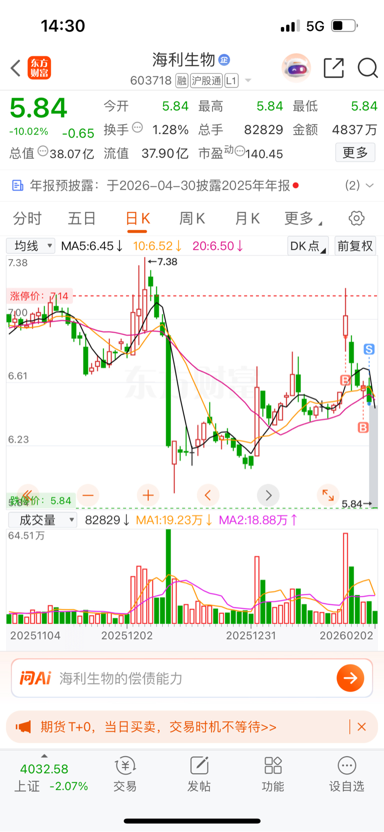 $海利生物(SH603718)$ 我去……