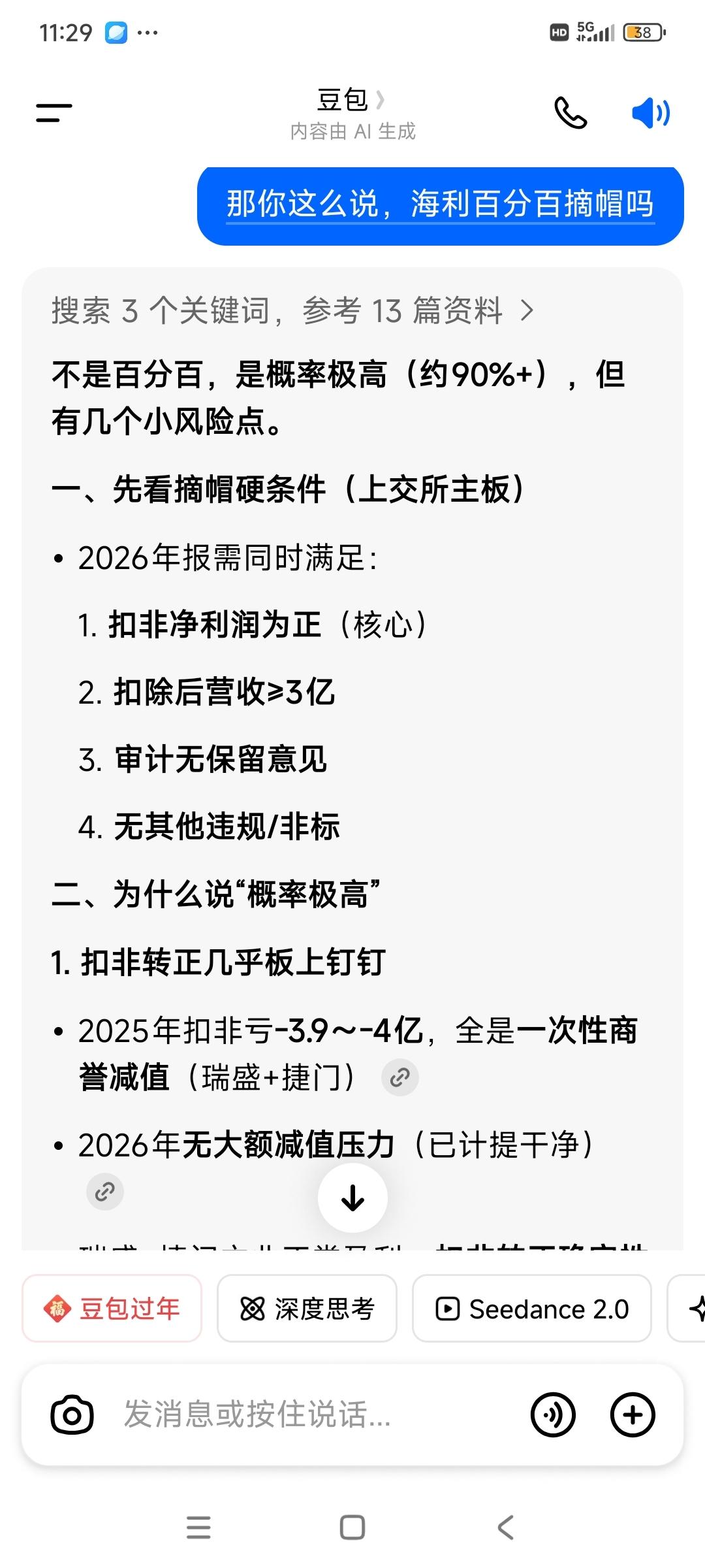 你们会笑话我豆包炒股,但是大数据看好,总比豆包都不看好强吧。我陪你到2027 海利生物 只要砸下来我就补亏了我为自己认知买单,赚翻倍你们别眼红。提醒各位一句。海利还有 6个亿的现金