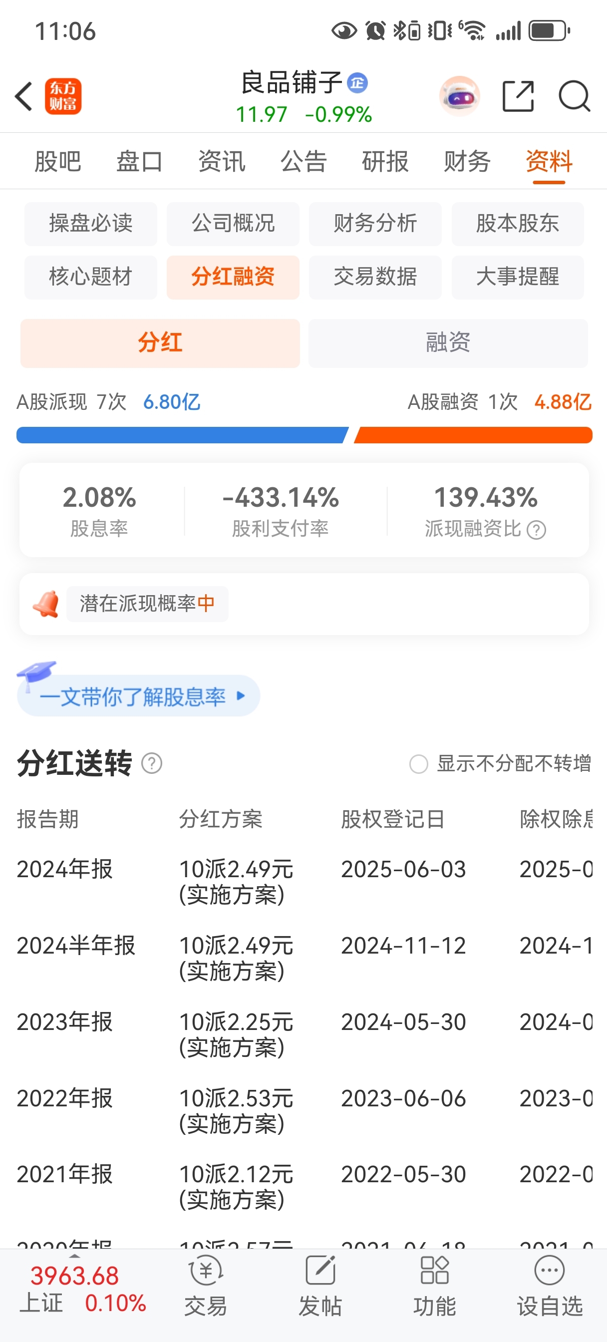 $良品铺子(SH603719)$ 虽然股价下跌,但是还是良心企业,每年都有分红的