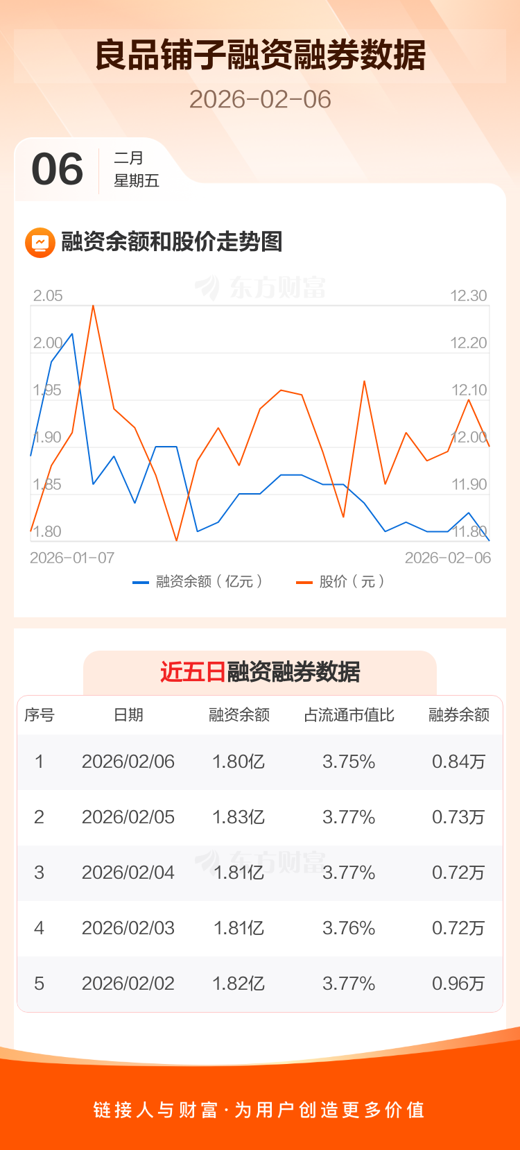 交易所最新数据显示,良品铺子于2026年2月6日获融资买入475.90万元,融资偿还737.44万元,当日融资净偿还261.53万元。目前,该股融资余额1.80亿,占流通市值比例为3.75%。