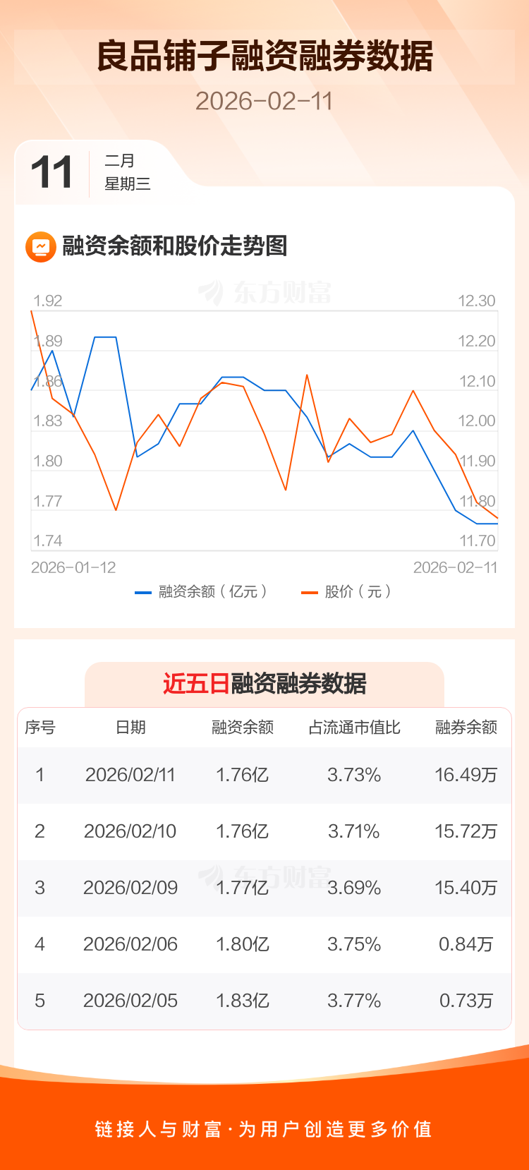交易所最新数据显示,良品铺子于2026年2月11日获融资买入366.66万元,融资偿还337.19万元,当日融资净买入29.47万元。目前,该股融资余额1.76亿,占流通市值比例为3.73%。