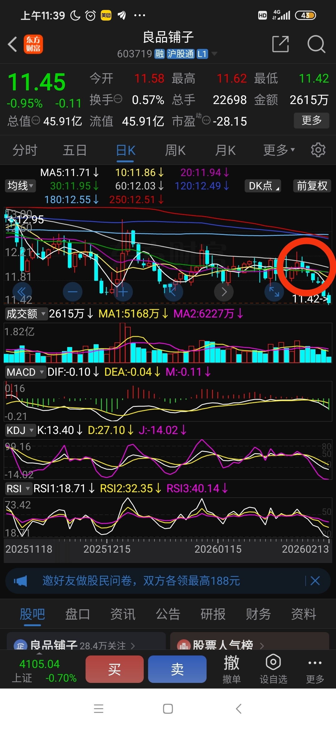 $良品铺子(SH603719)$ 一个死蜘蛛,均线粘合多日结果选择向下,一致看空,每天阴跌,空头氛围很强,到目前又出现底背离了,已经底背离很久了,很矛盾,哪个看得懂后面如何走