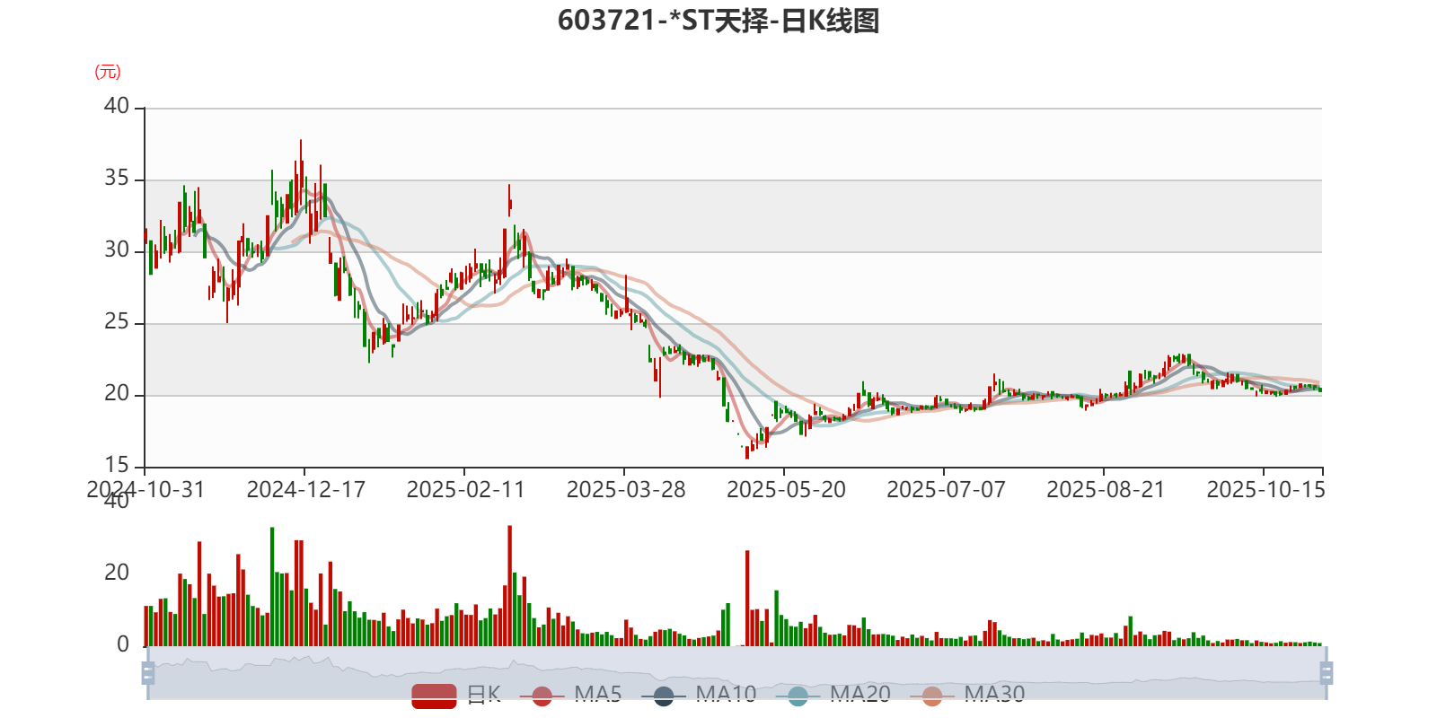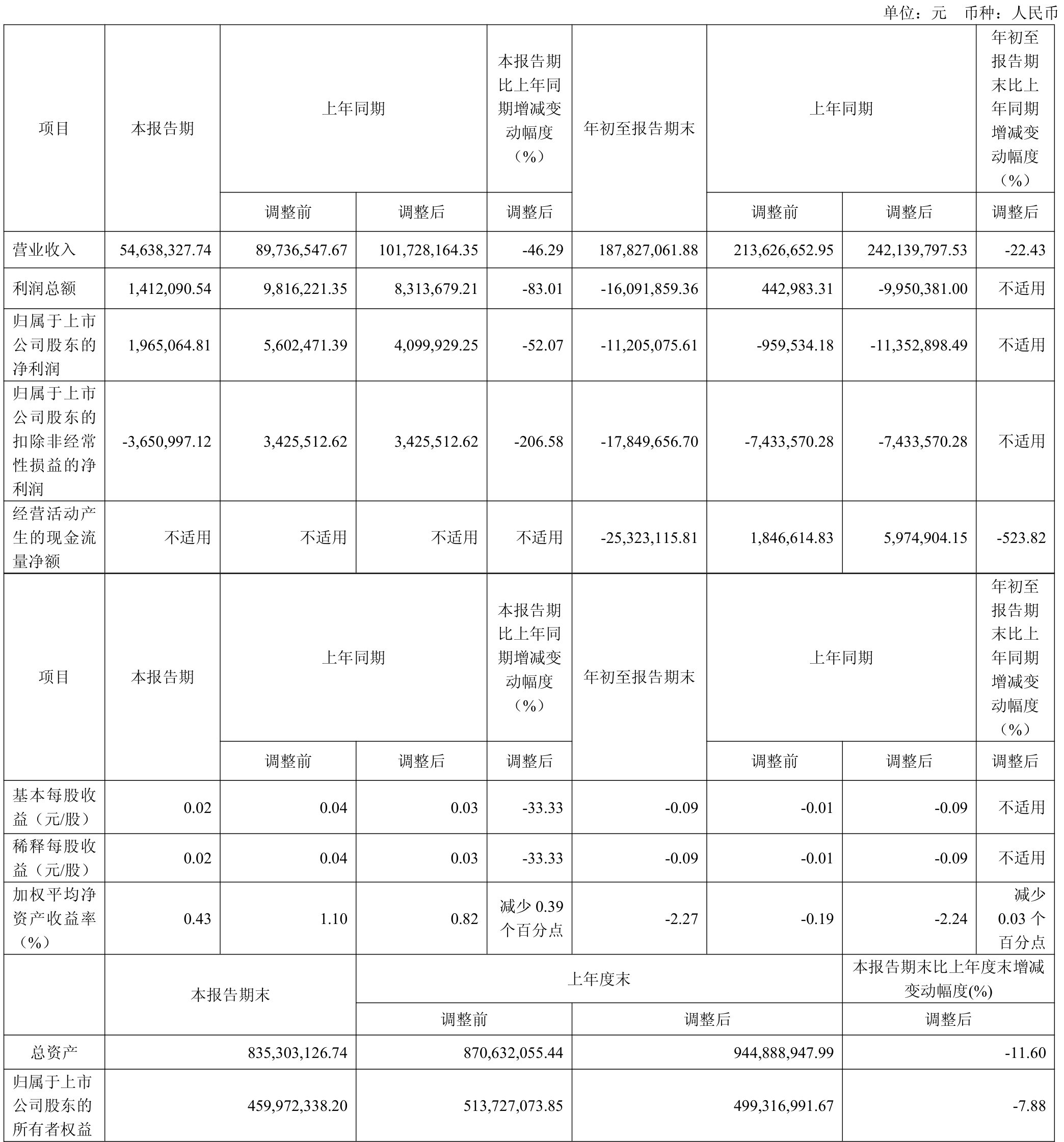 中证智能财讯 *ST天择(603721)10月31日披露2025年第三季度报告。前三季度公司实现营业总收入1.88亿元,同比下降22.43%;归母净利润亏损1120.51万元,上年同期亏损1135.29万元;扣非净利润亏损1784.97万元,上年同期亏损743.36万元;经营活动产生的现金流量净额为-2532.31万元,上年同期为597.49万元;报告期内,*ST天择基本每股收益为-0.09元,加权平均净资产收益率为-2.27%。