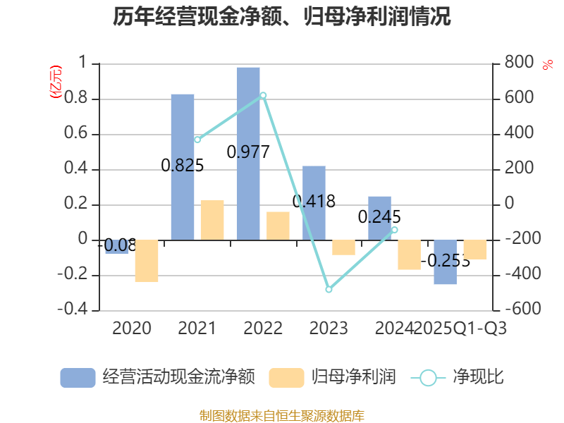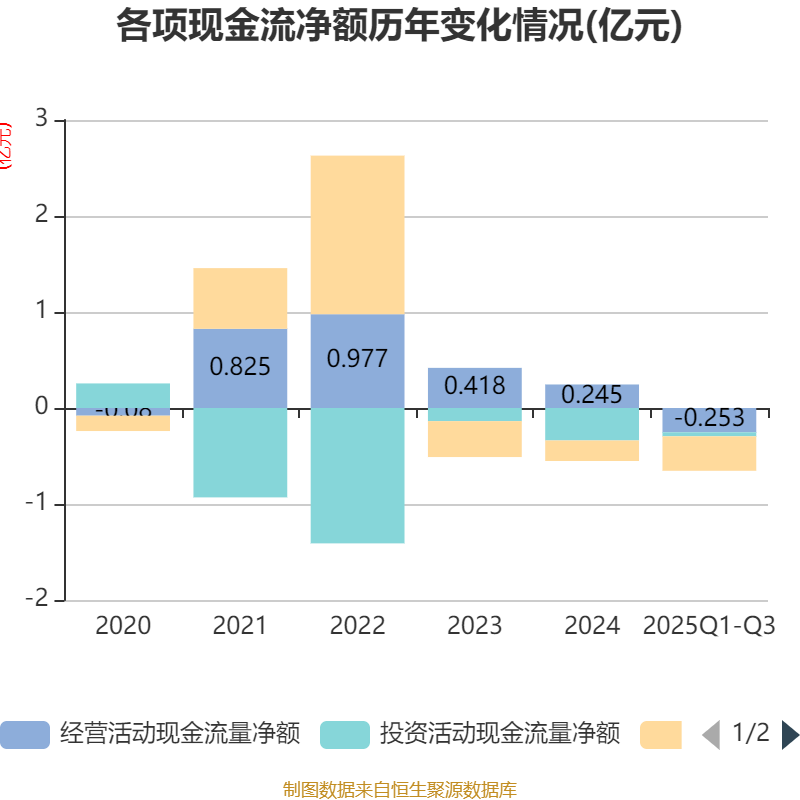 2025年前三季度,公司经营活动现金流净额为-2532.31万元,同比减少3129.8万元;筹资活动现金流净额-3590.92万元,同比减少1341.49万元;投资活动现金流净额-423.39万元,上年同期为-2527.52万元。