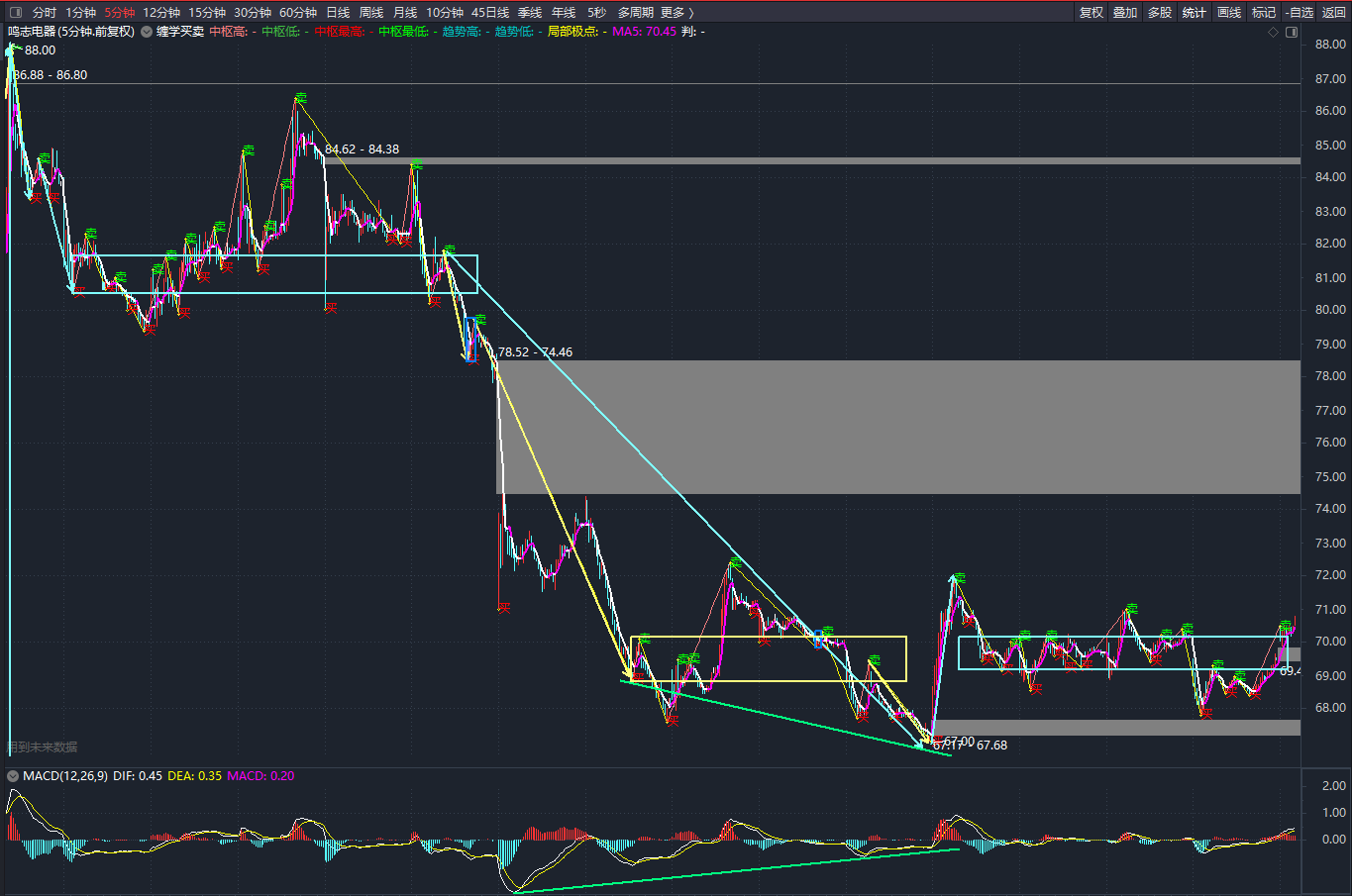 5分钟周期看走势:已建仓,后续逢跌1元不断买入(不满仓干,胆子大的半仓干,根据自己可承受的损失定止损,公式:买入股数=可损失资金÷止损差额)。例子:可损失金额=3000元,止损差额=70元(买入价)-69元(止损价)=1元,代入公式:买入股数=3000元÷1元=3000股。