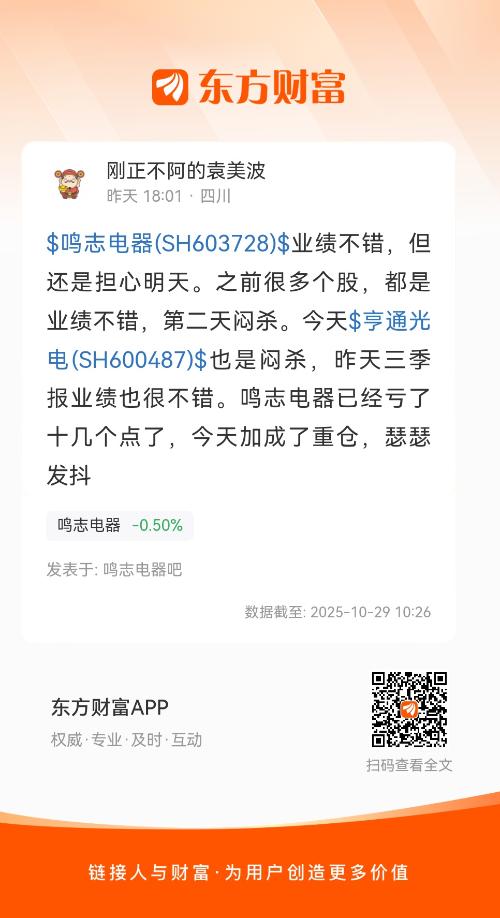 $鸣志电器(SH603728)$业绩不错,但还是担心明天。之前很多个股,都是业绩不错,第二天闷杀。今天$亨通光电(SH600487)$也是闷杀,昨天三季报业绩也很不错。鸣志电器已经亏了十几个点了,今天加成了重仓,瑟瑟发抖