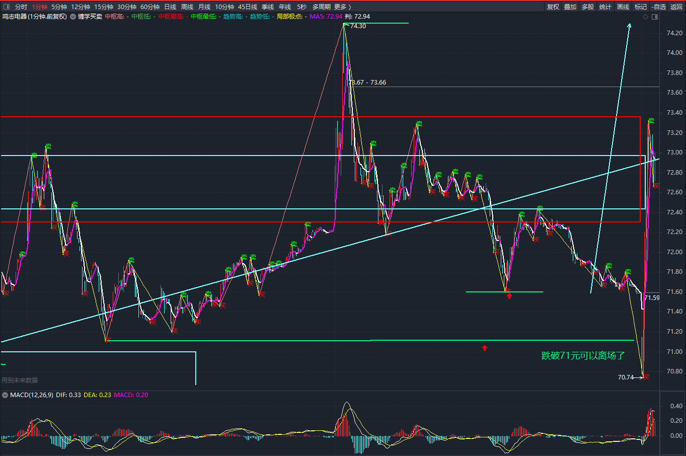 1分钟看走势,昨天我说:跌破71元离场,主要试探一下这个论坛是否有庄家卧底;果不其然,开盘向下跳空跌破71元,打我止盈线,然而我并没有离场,反而坚定持股(昨天收盘前进了些货),刚才72.91元卖出昨天买的货,留了底仓继续做T。我把交易周期调到1分钟做交易,认真对待操作!这支股的操盘团队技术很强。只要散户团结起来就能挣钱,大家有没有听说过美国散户怎么暴打华尔街空头。哈哈哈