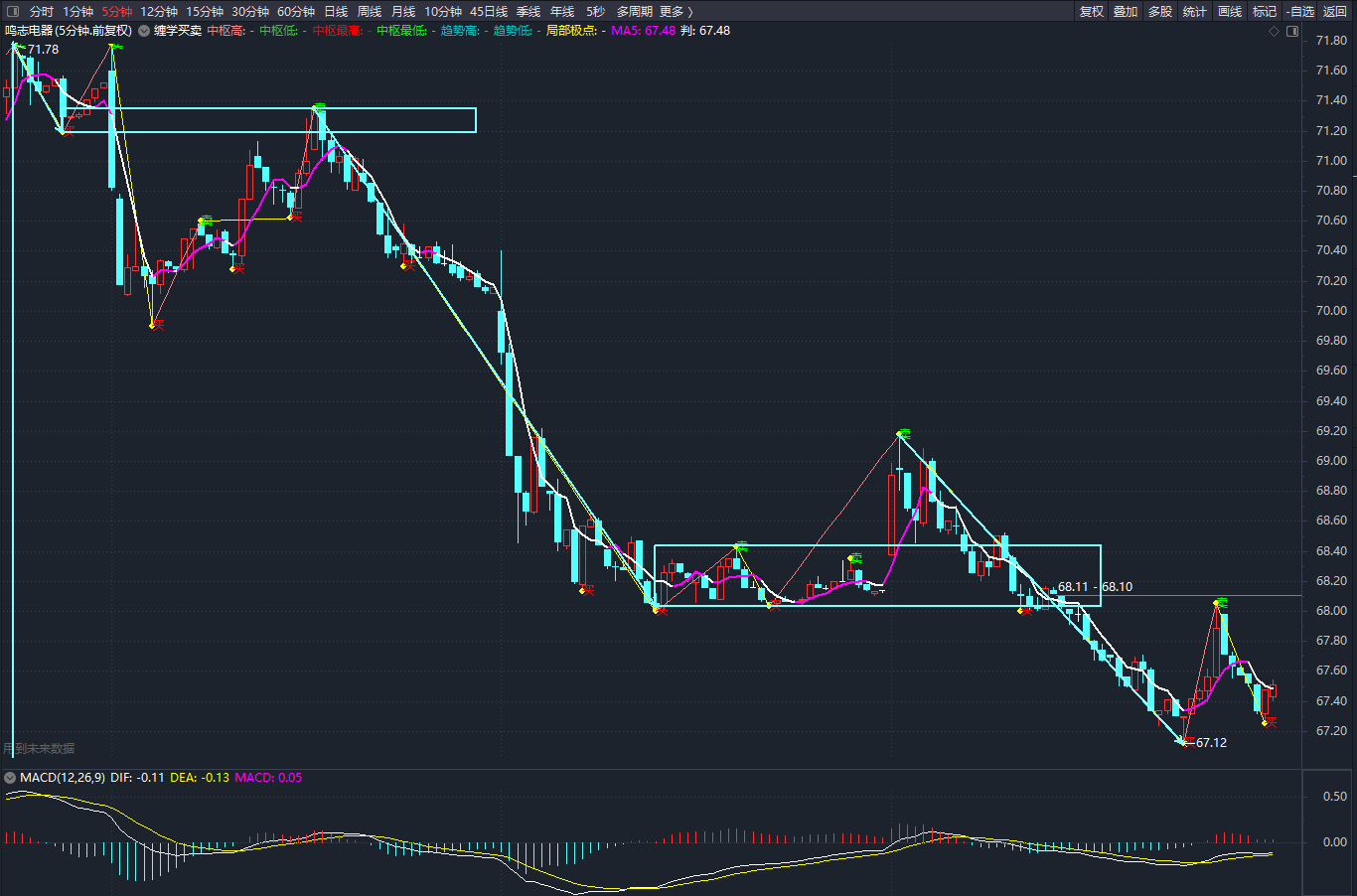 一分钟看走势:开始建仓,看能否打出有力度地突破68.05元:1.有力度突破:持股