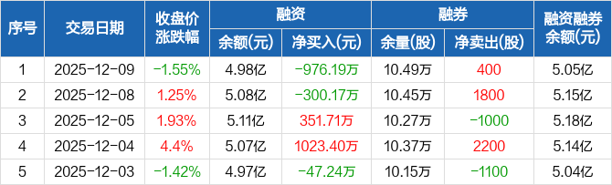 鸣志电器:融资净偿还976.19万元,融资余额4.98亿元(12-09)