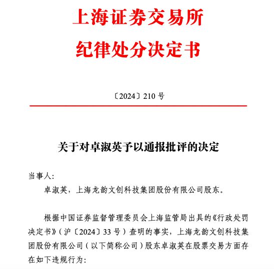 上交所11月12日发布公告,龙韵股份(603729)股东卓淑英因其在股票交易中存在违规行为,被予以通报批评。