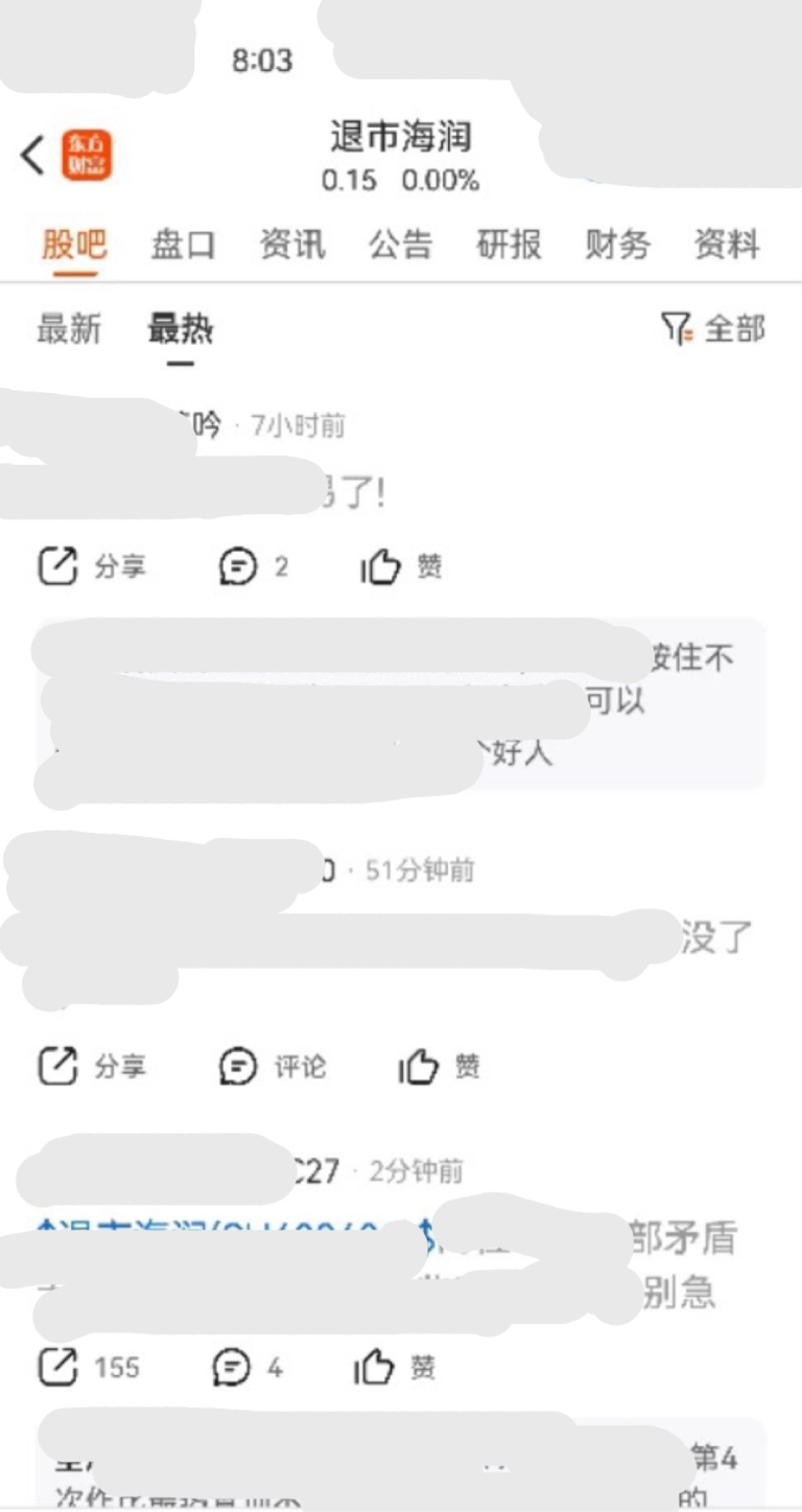 吧长12月24时间晚上8:03,紧急情况这回是退市海润极速直接把不是内部矛盾无股