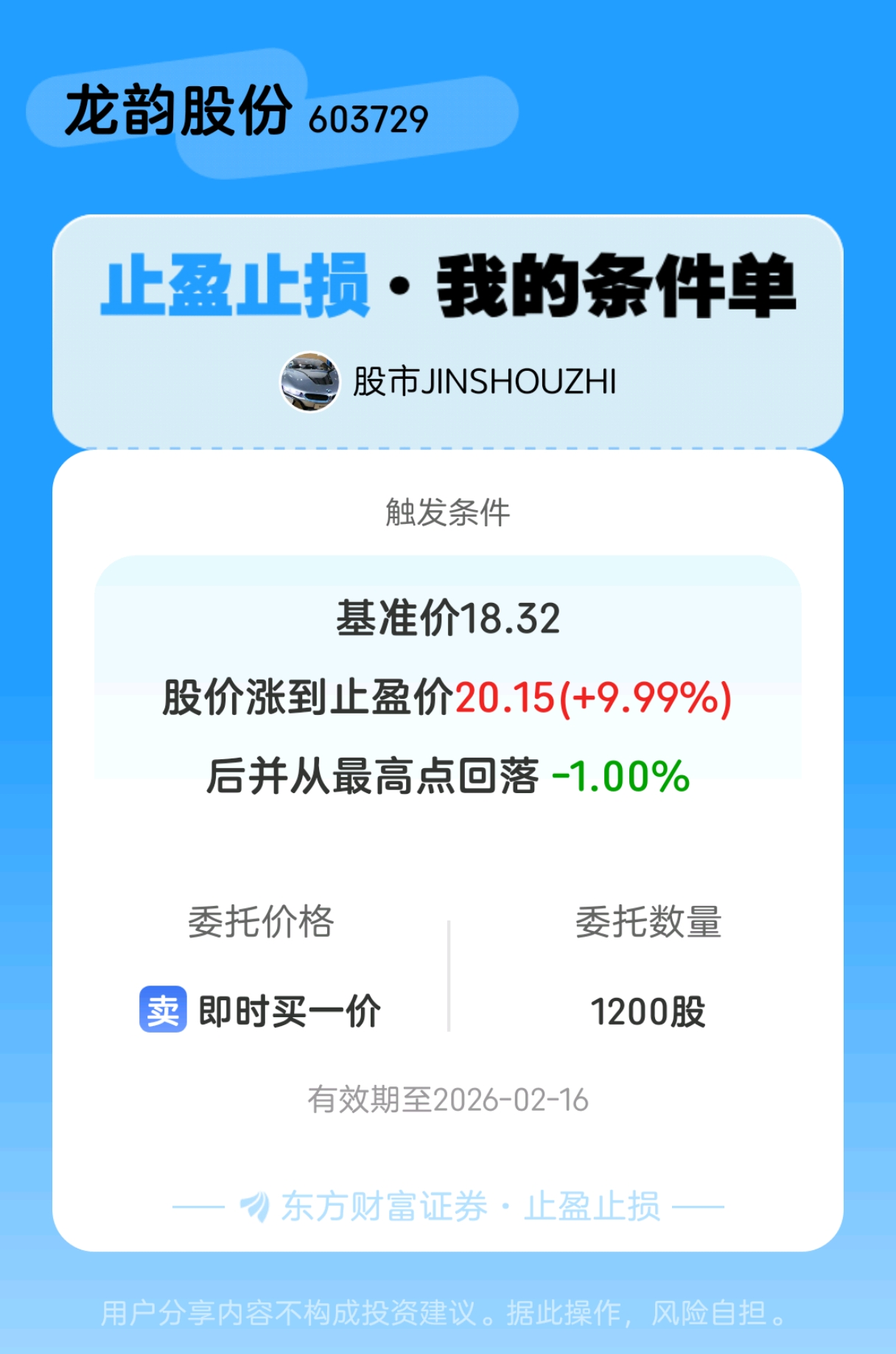 #条件单交流# #止盈止损晒单# 一位股神设置了一个止盈止损条件单,接下来就是见证奇迹的时刻~$龙韵股份(SH603729)$