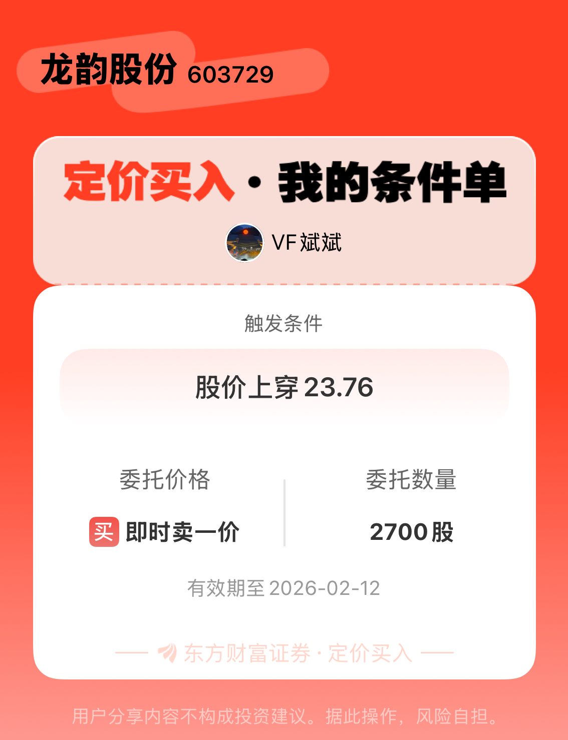 #条件单交流# #定价买入晒单# 一位股神设置了一个定价买入条件单,接下来就是见证奇迹的时刻~$龙韵股份(SH603729)$