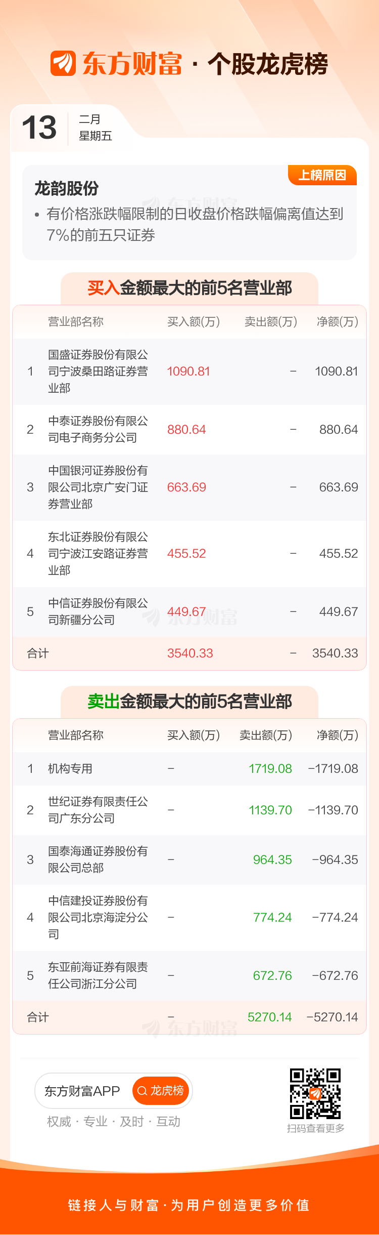 交易所2026年2月13日公布的交易公开信息显示,龙韵股份因成为有价格涨跌幅限制的日收盘价格跌幅偏离值达到7%的前五只证券上榜。龙韵股份当日收报19.25元,涨跌幅-9.96%,偏离值-8.70%,换手率19.39%,成交额3.55亿。