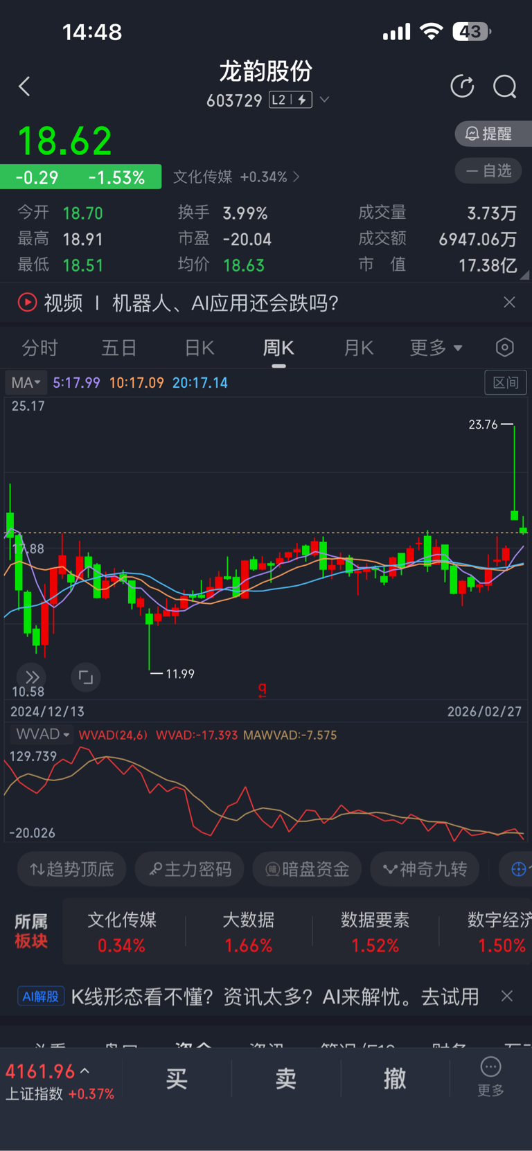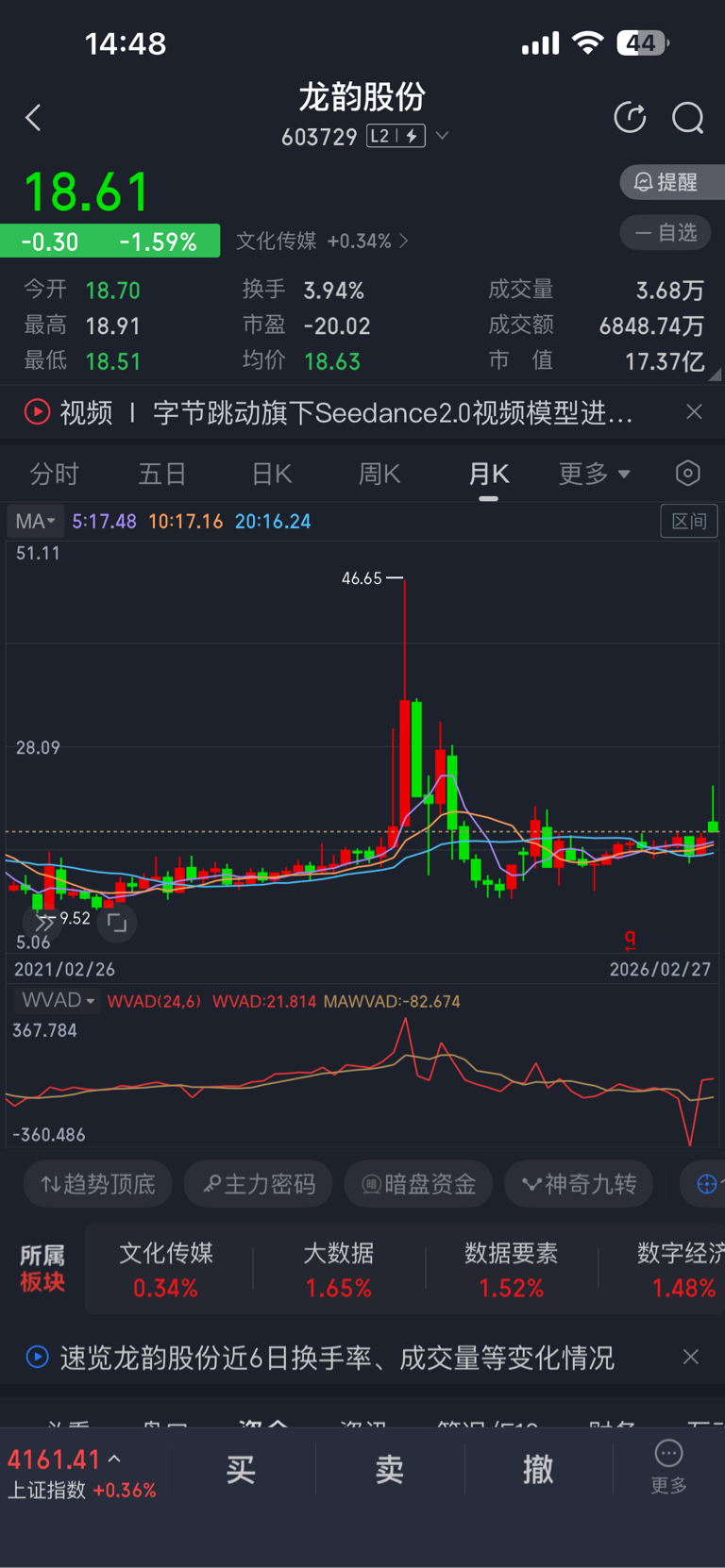 $龙韵股份(SH603729)$ 任何股票只要周月上影线,卖错也得卖,这种市场就是这样,形态代表未来趋势,就像这种形态,你就给我一万个胆子,我都不敢碰,周月双死叉,深不见底,不到四月底,这个票都起不来。
